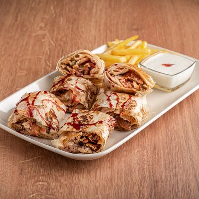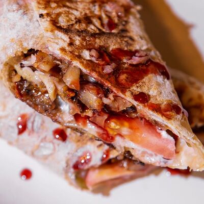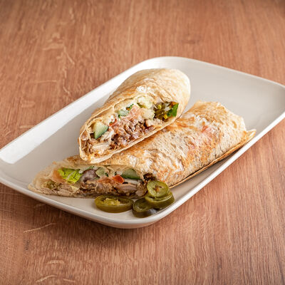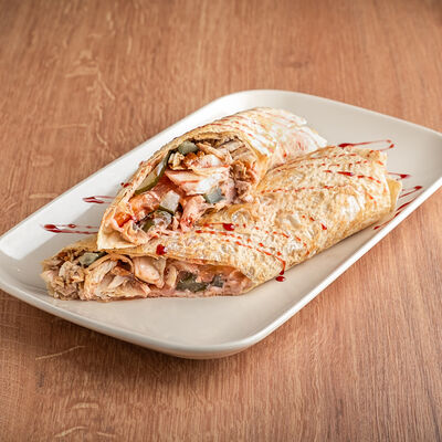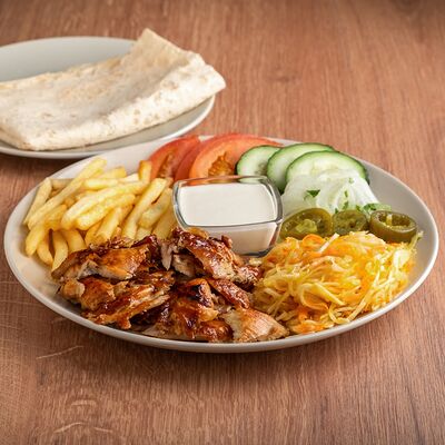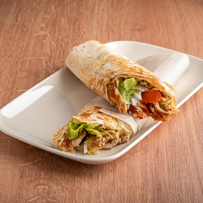 Курица, приготовленная на шампуре, овощной микс (помидоры, огурцы, пекинская капуста), фирменный соус, лаваш собственного приготовления