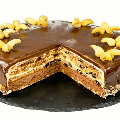 Мука высший сорт, яйцо, сахар, масло сливочное, шоколад, фундук, миндаль, кешью, чернослив, арахис, сливки, молоко, желатин, ароматизатор, гель-декор. Может содержать следы орехов, злаков, молочных продуктов