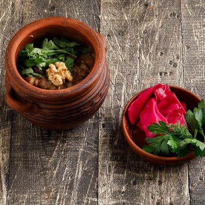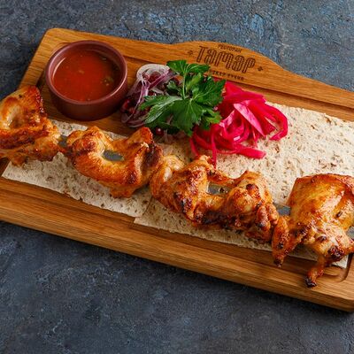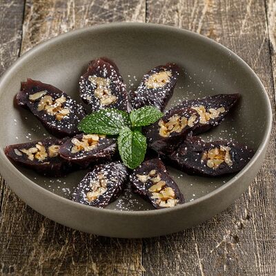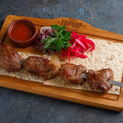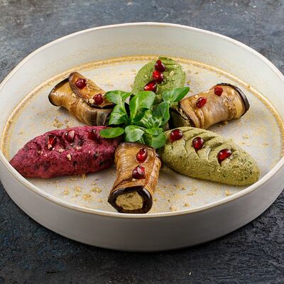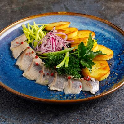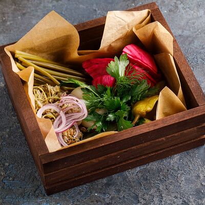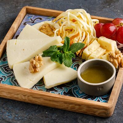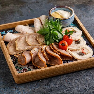 Буженина, куриный рулет (куриной филе с болгарским перцем и маслинами), копченая индейка, отварной говяжий язык. Подается с горчицей и хреном, украшается маринованными черри помидорчиками и зеленью (укроп и петрушка)
