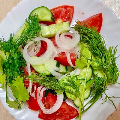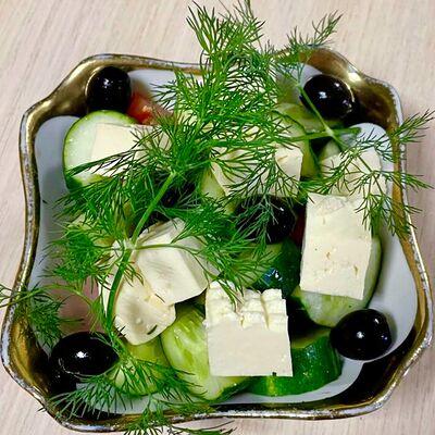 Хрустящий огурец, сочный помидор, сыр брынза, оливки, зелень