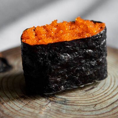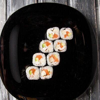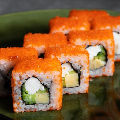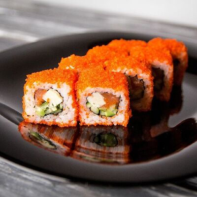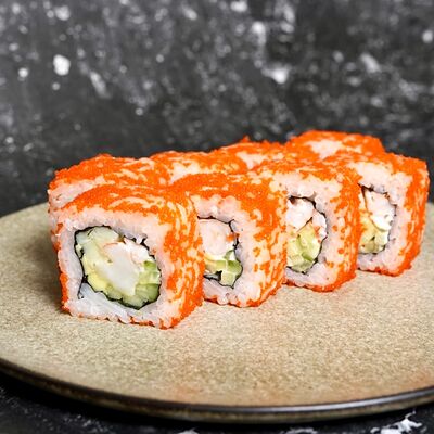 Рис, нори, креветка, сыр сливочный, майонез, огурец, омлет, икра летучей рыбы, замес сырный