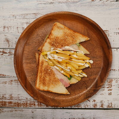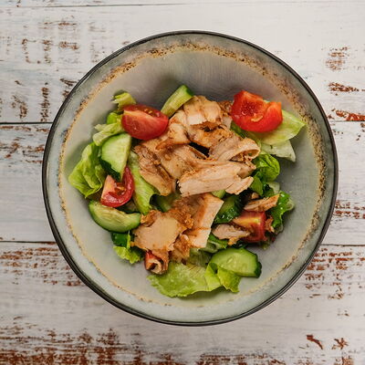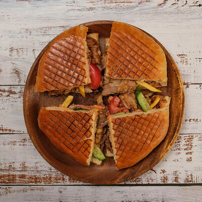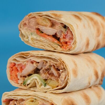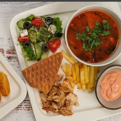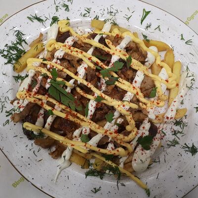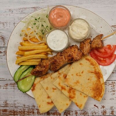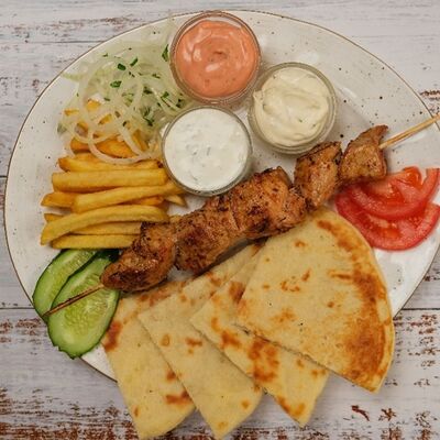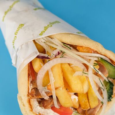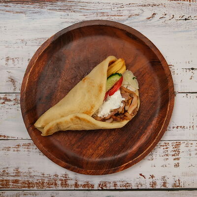 Мясо курица, пита, томат, огурец Зелен, лук, картофель фри, соуси Дзадзики, коктейлный, чесночный