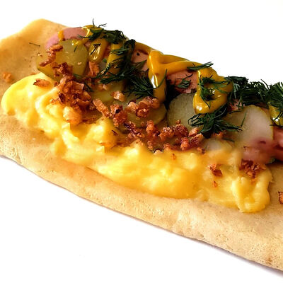 Ветчина Картофельное пюре Огурец маринованный Лук фри Соус сливочный