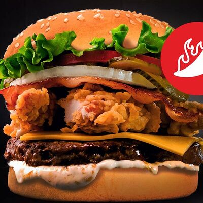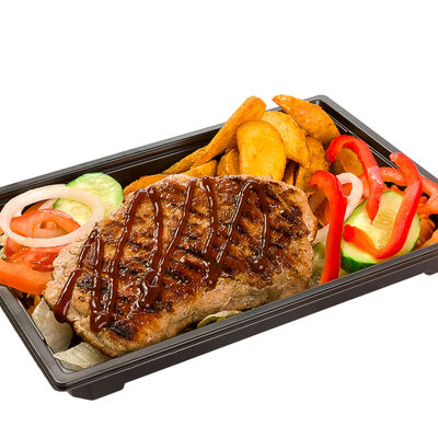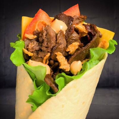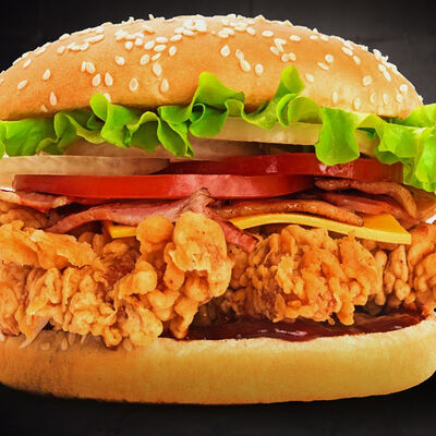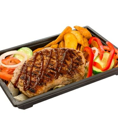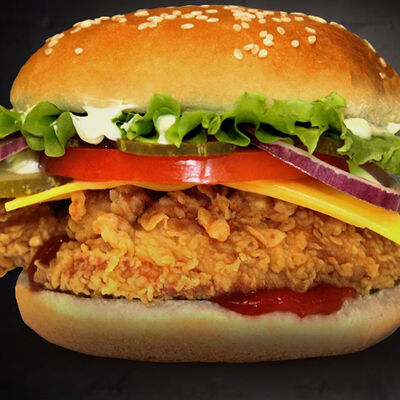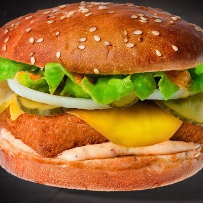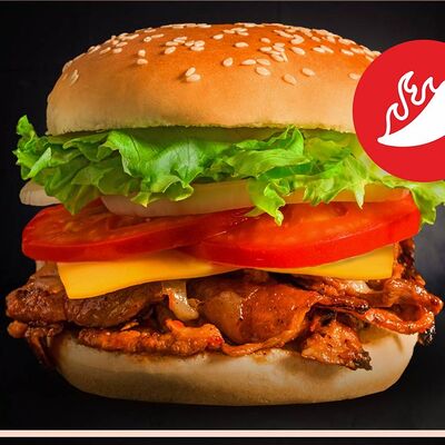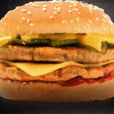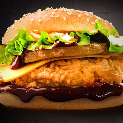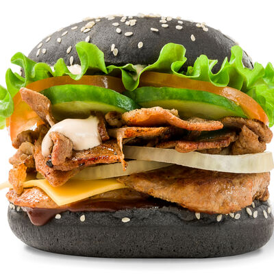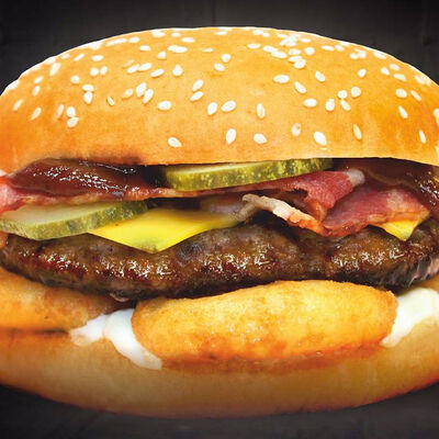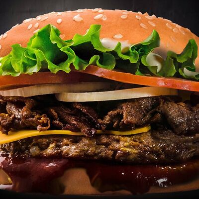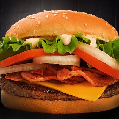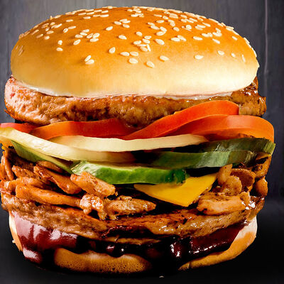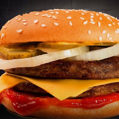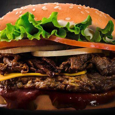 Большая булочка с кунжутом, сочный говяжий бифштекс Плюс, маринованная говяжья нарезка, сочный салат айсберг, свежий томат, лук репчатый, нежный ломтик сыра Hochland и все это под соусом майонез и барбекю