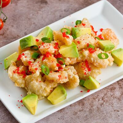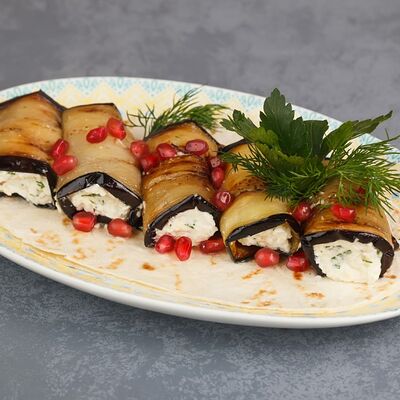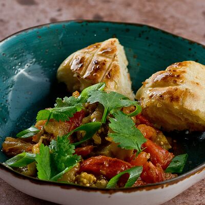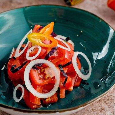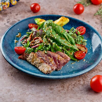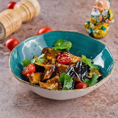 Теплы салат из хрустящих баклажанов со свежими томатами и кинзой, посыпается кунжутными семенами