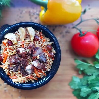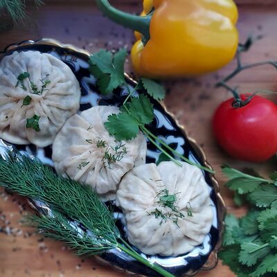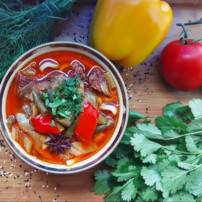 Говядина, куриное филе, зелень, лук, соль, красный перец сладкий, жир бараний сетка свёрнутый, чёрный перец (1 шт.)