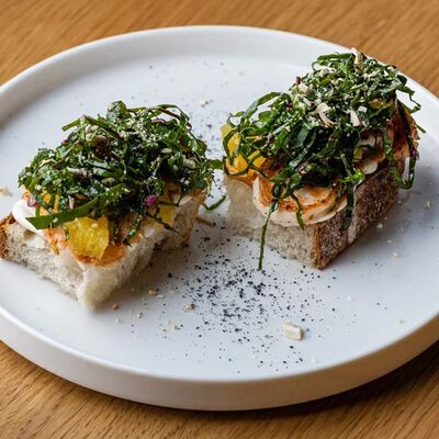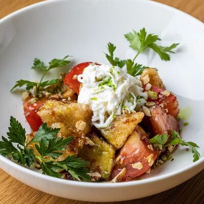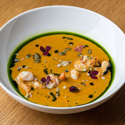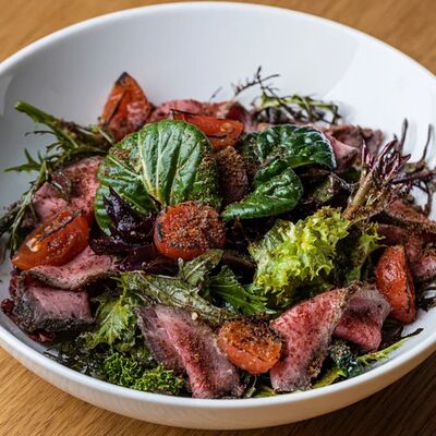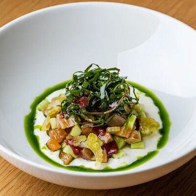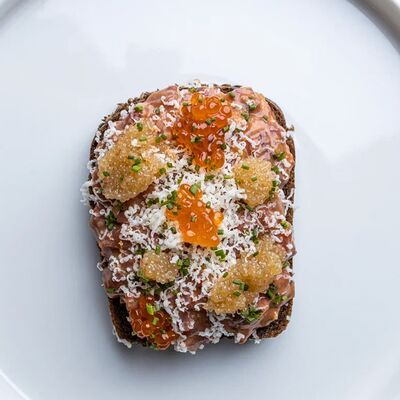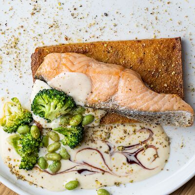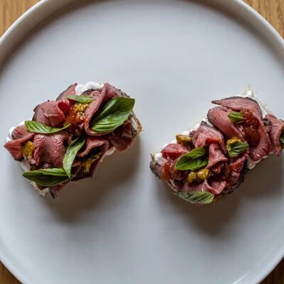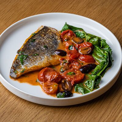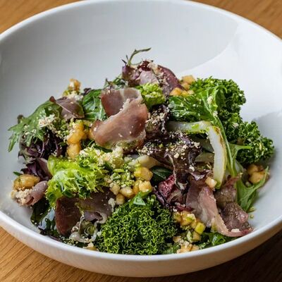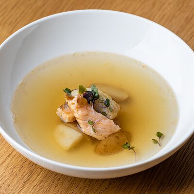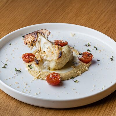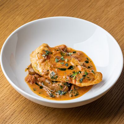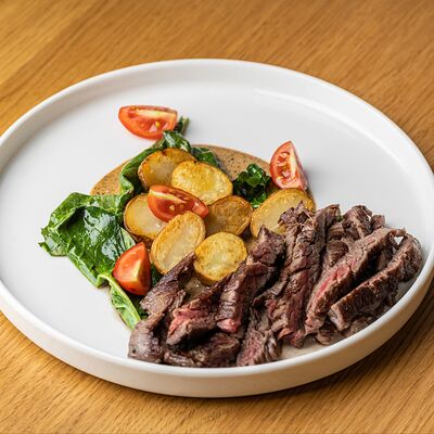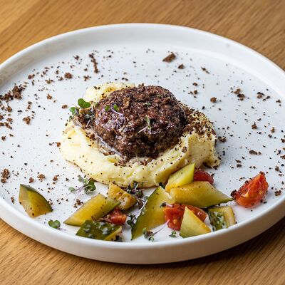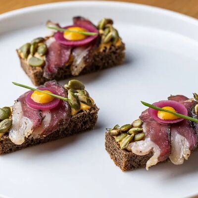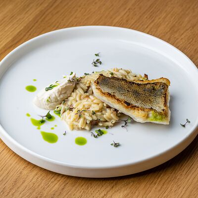 Утиная грудка, рис арборио, сливочный соус на основе сыра канталь, вешенка фри, соус на основе малинового пюре и можжевельника