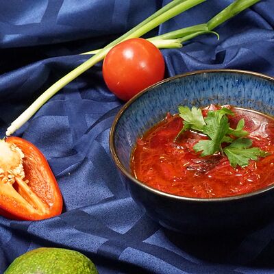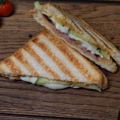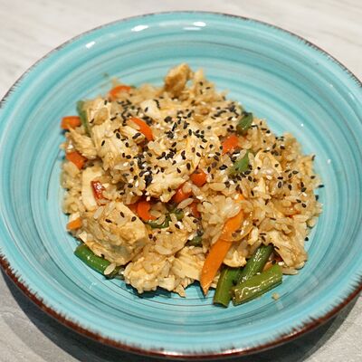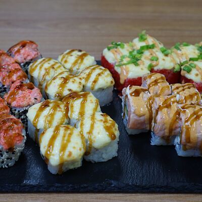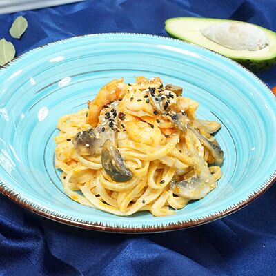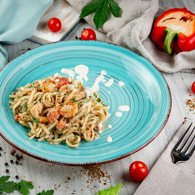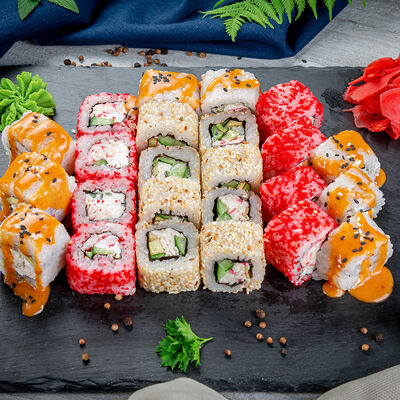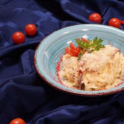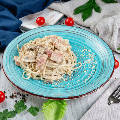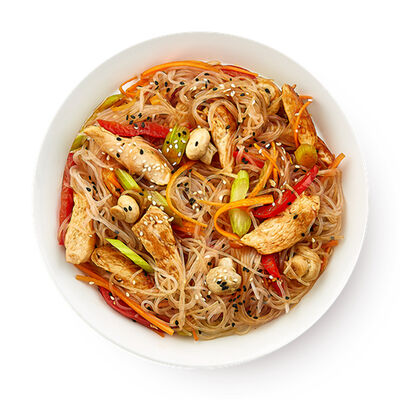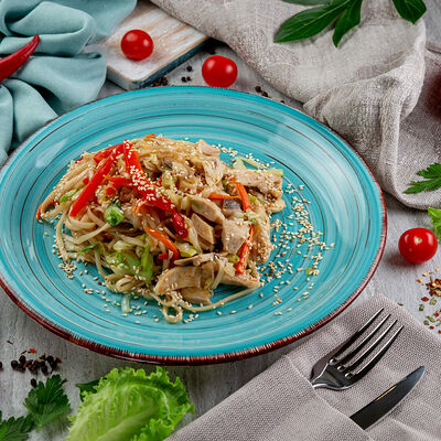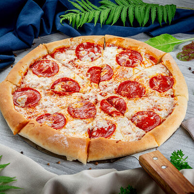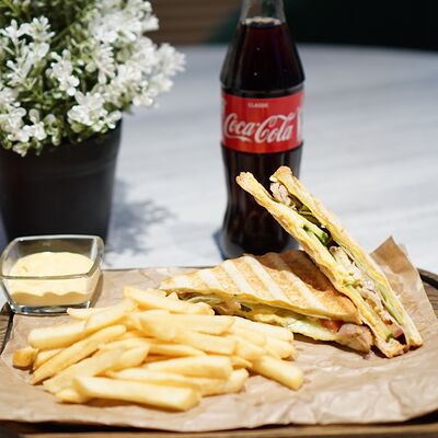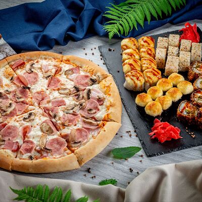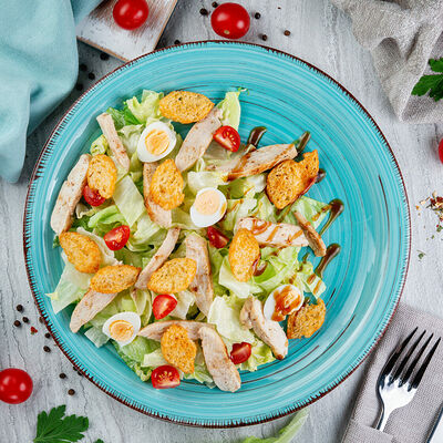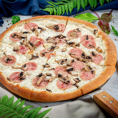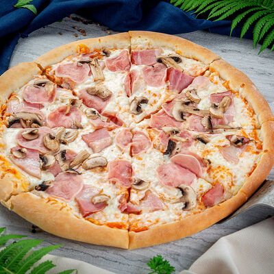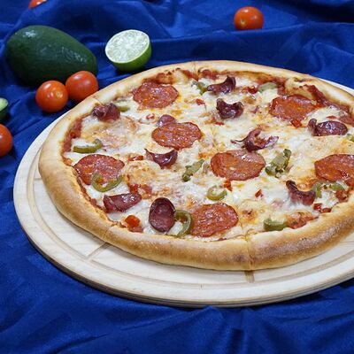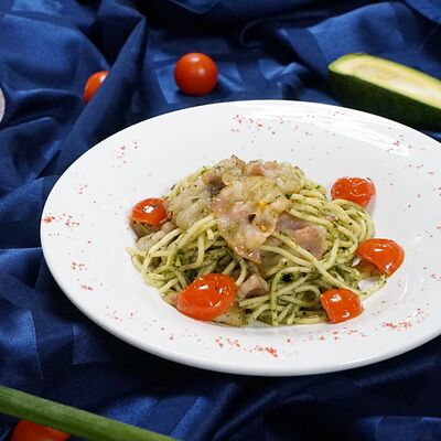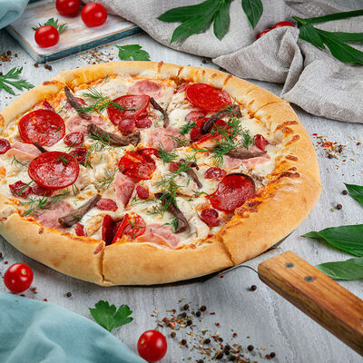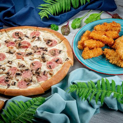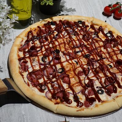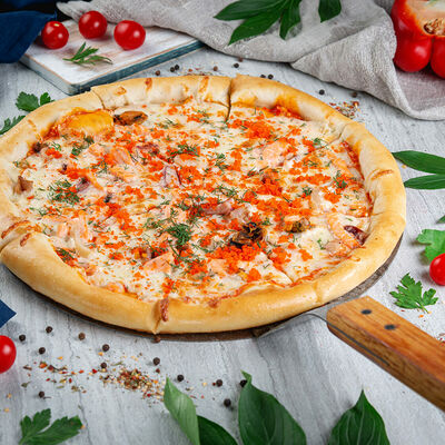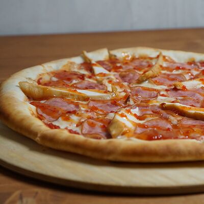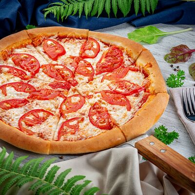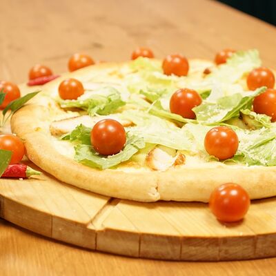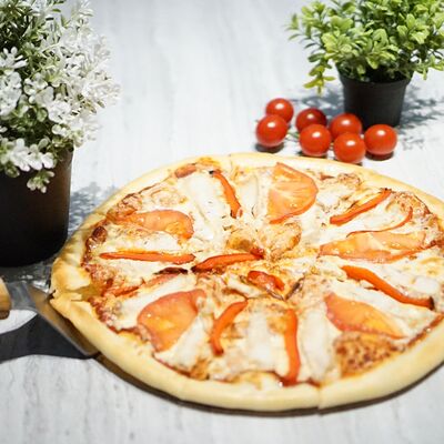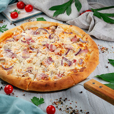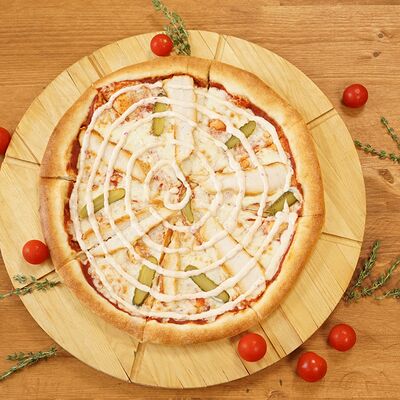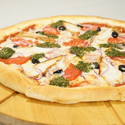 Моцарелла, томаты, курица, лук, оливки, соус песто