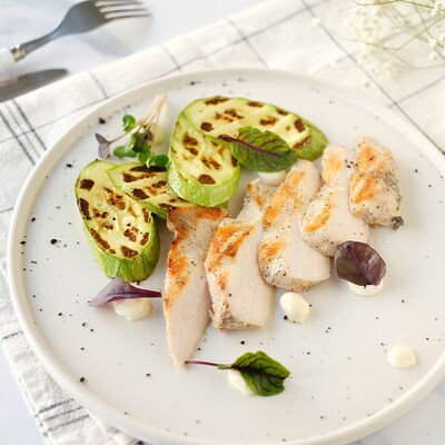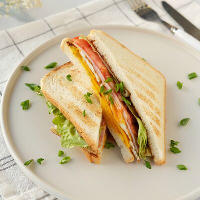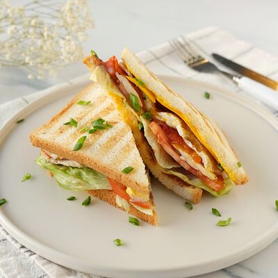 Хлеб Harrys, яйцо, курица, сыр, лист салата, помидоры свежие, печеный перец, соус сырный, соус барбекю, зеленый лук