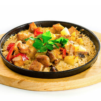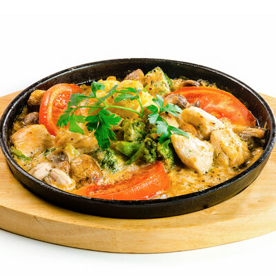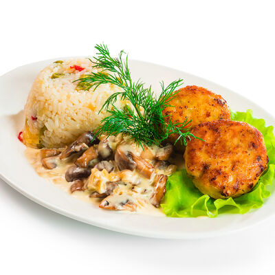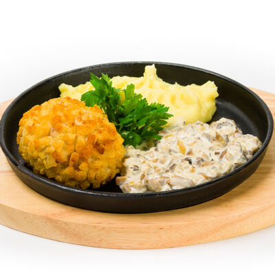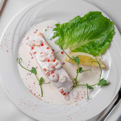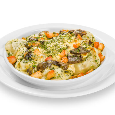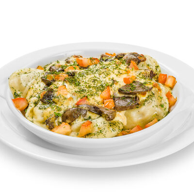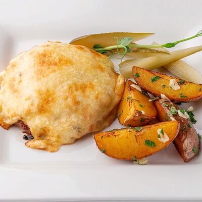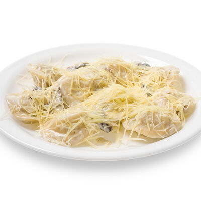 Судак, сливки, тесто, шампиньоны, сыр пармезан