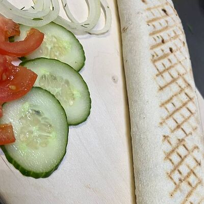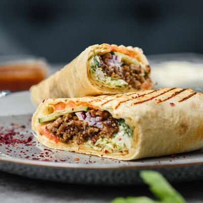 Булки, говядина, соус белый, соус красный, лук красный, огурец, помидор