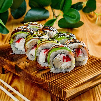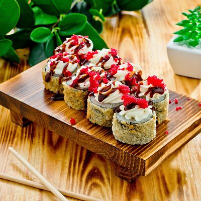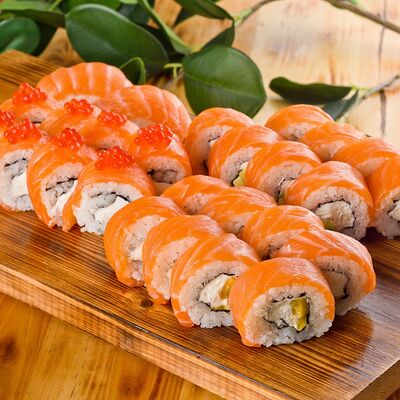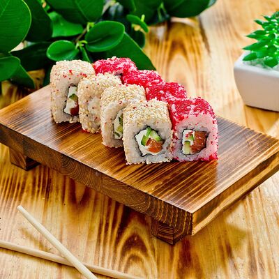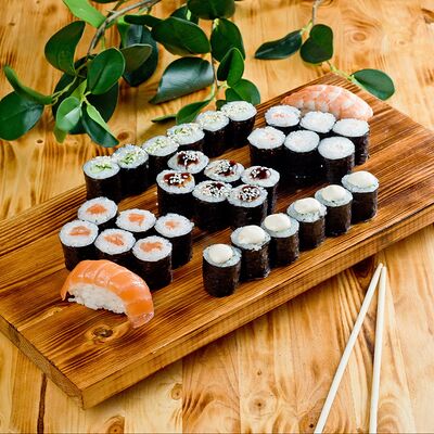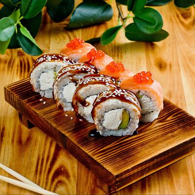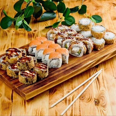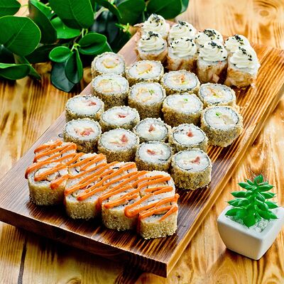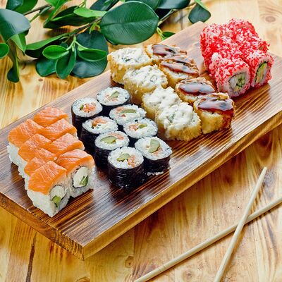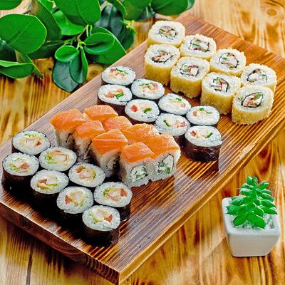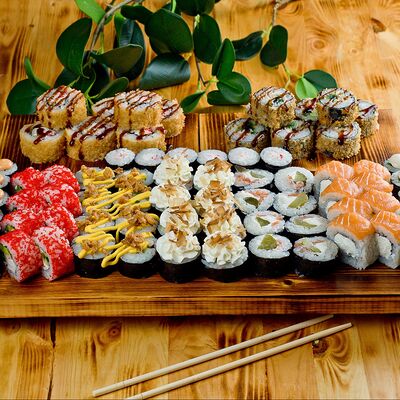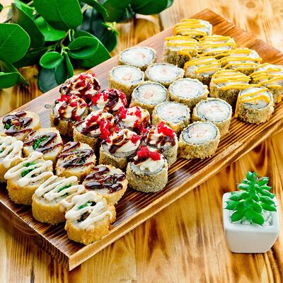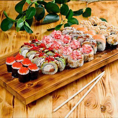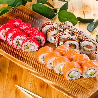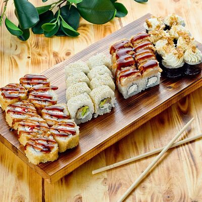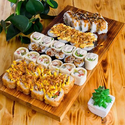 Чука маки, Кани маки, Крейзи маки, Ролл X.O, Сяке чиз, Асгард, Тейшоку, Калифорния с крабом, Кани темпура, Унаги темпура (76 шт.). Специи в сет не включены