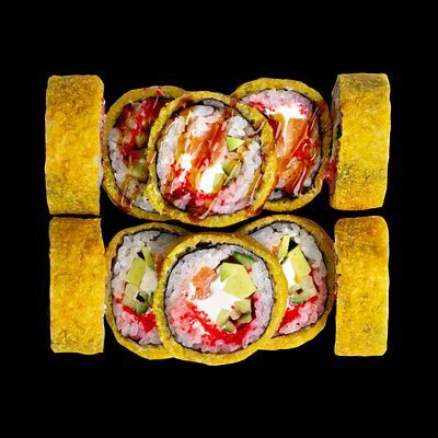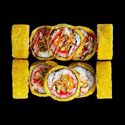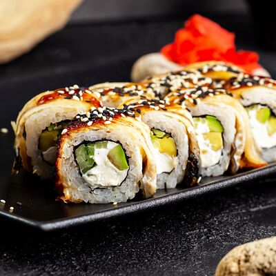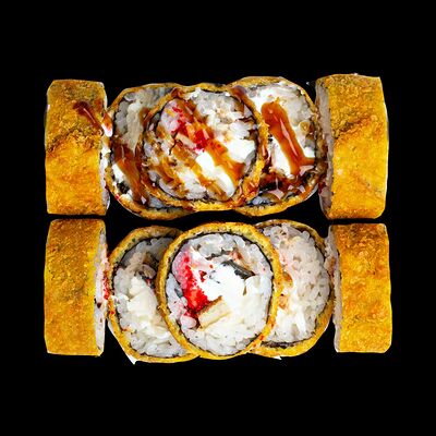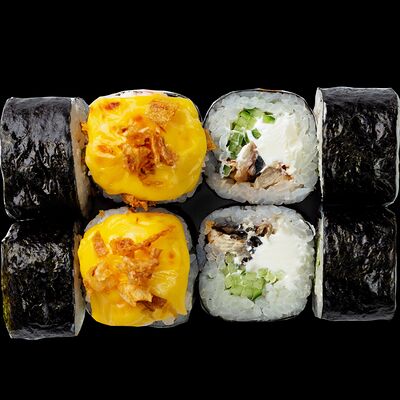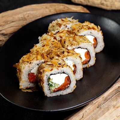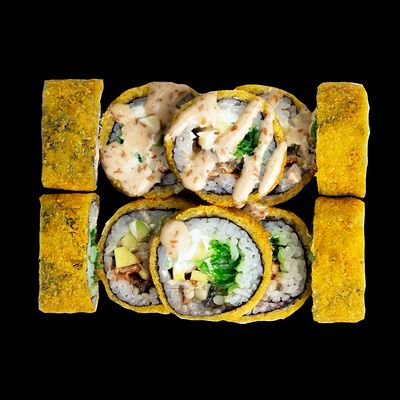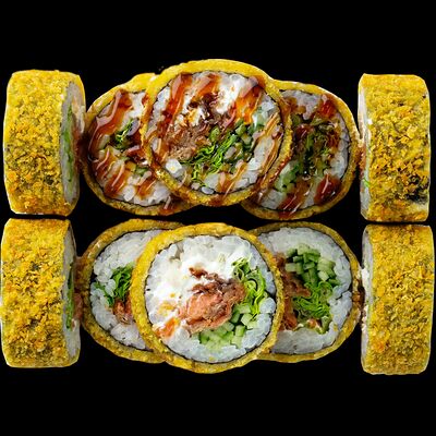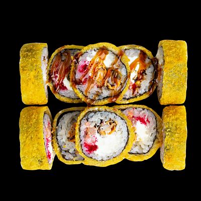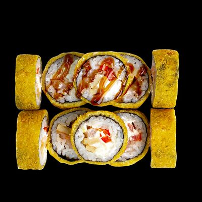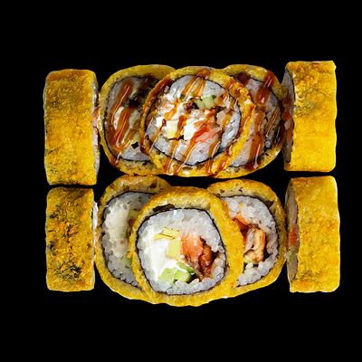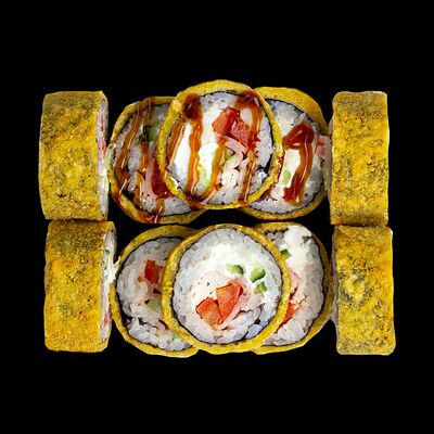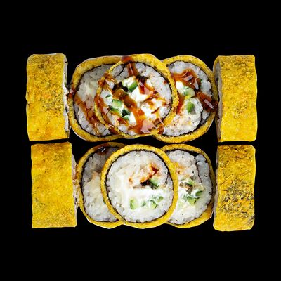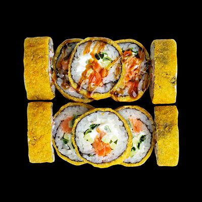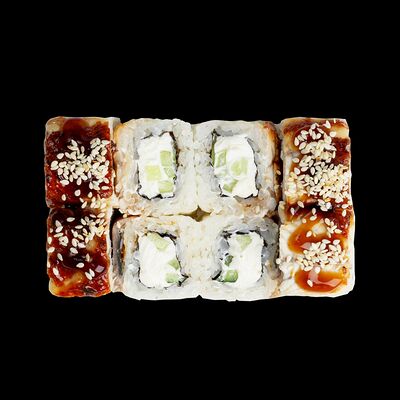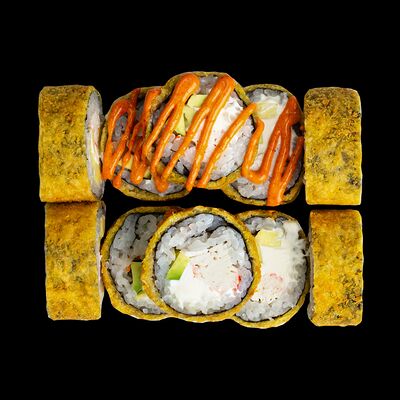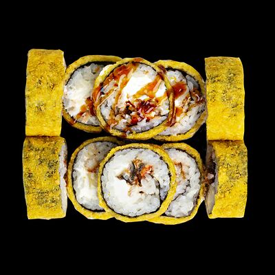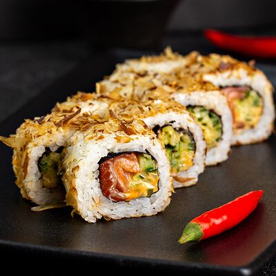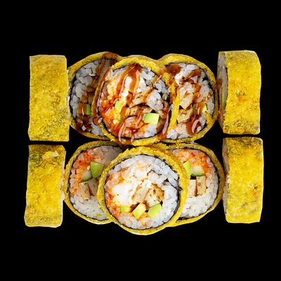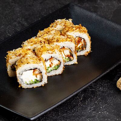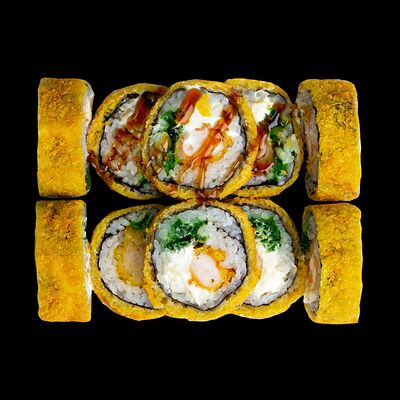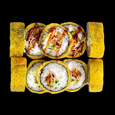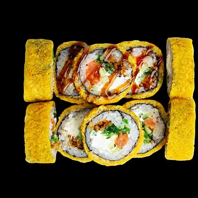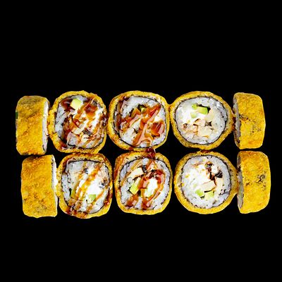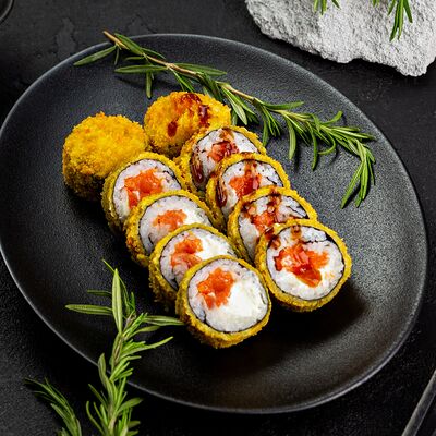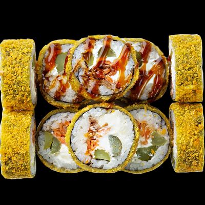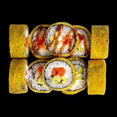Рис, нори, сыр, авокадо, лосось слабосоленый, унаги-соус, кляр, сухари