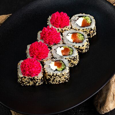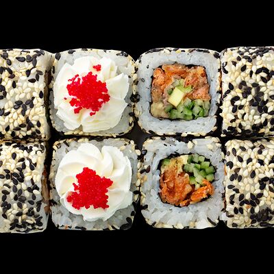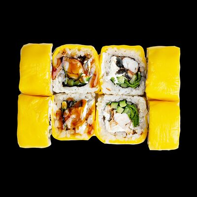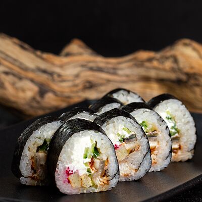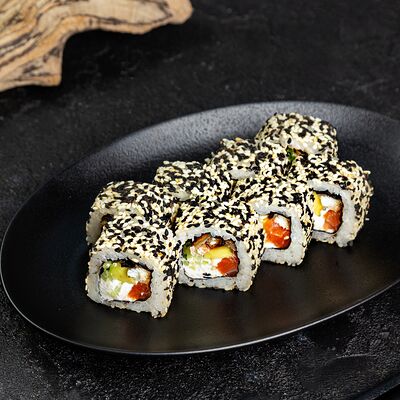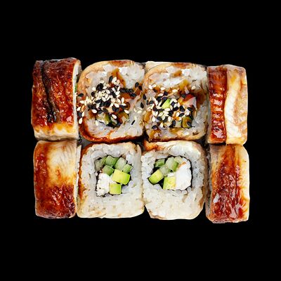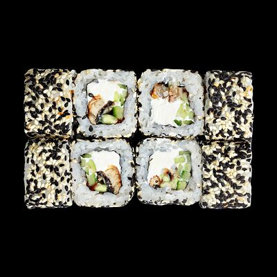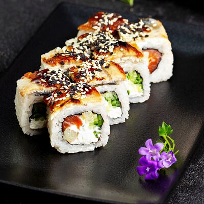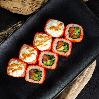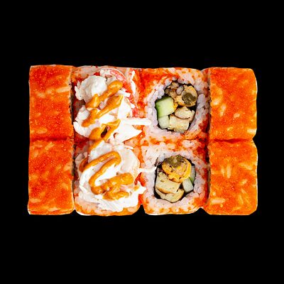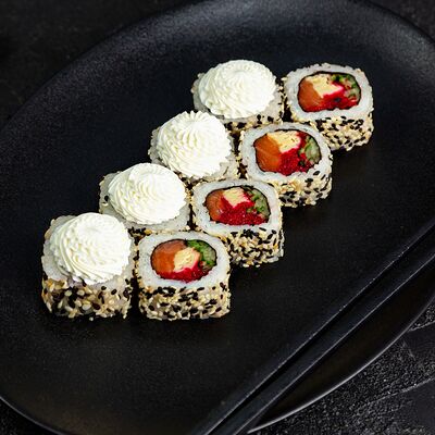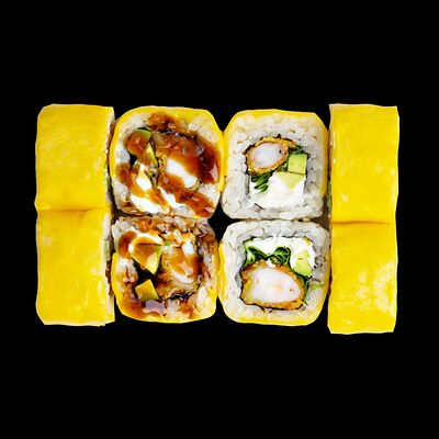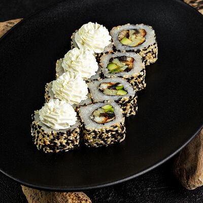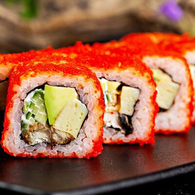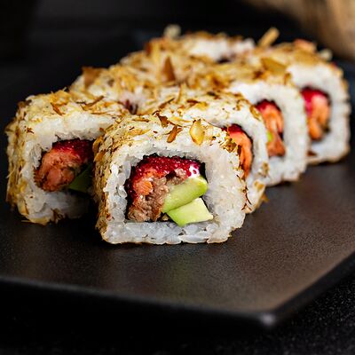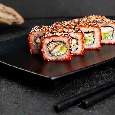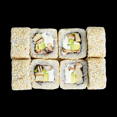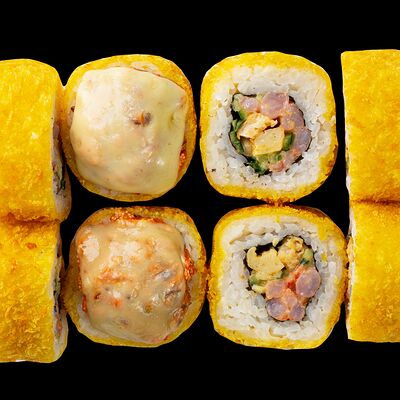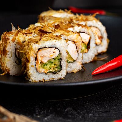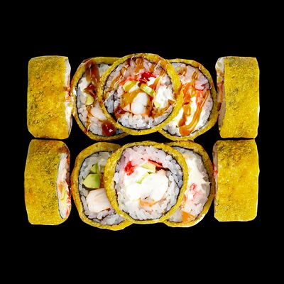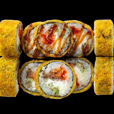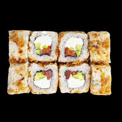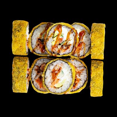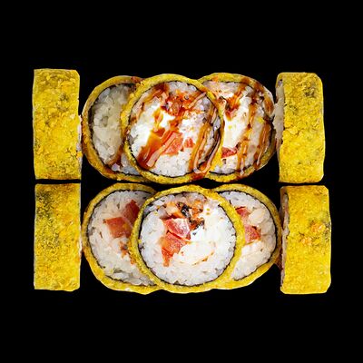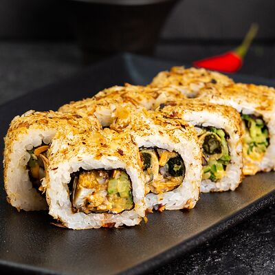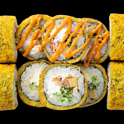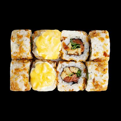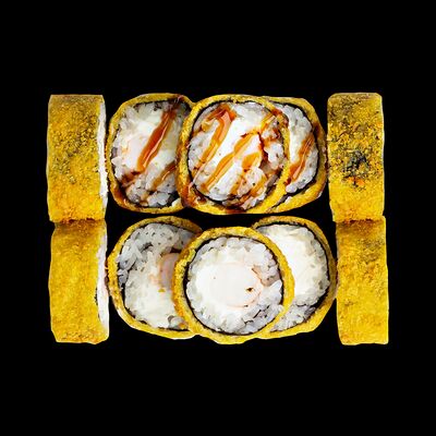 Рис, нори, сыр, авокадо, лосось слабосоленый, унаги-соус, кляр, сухари