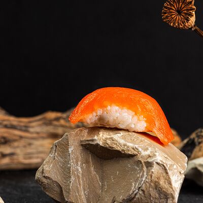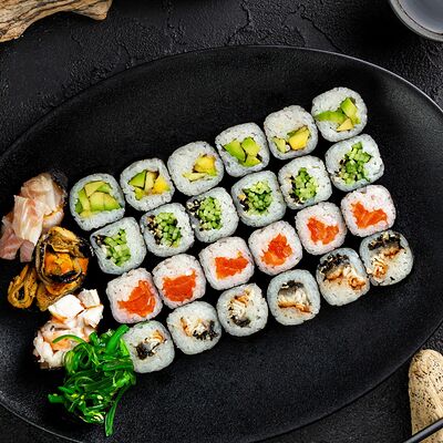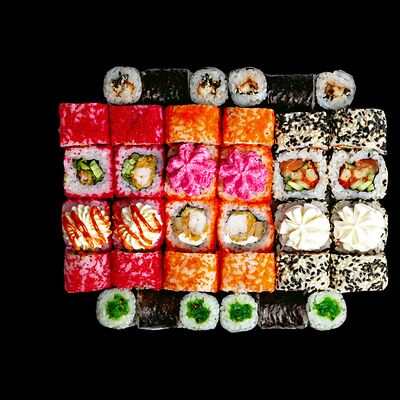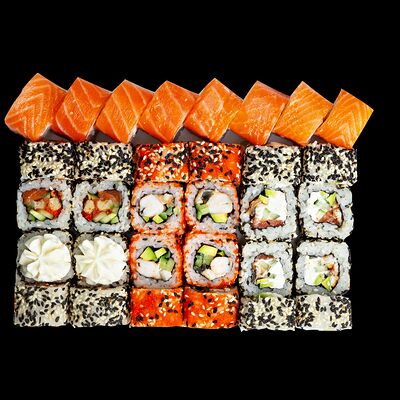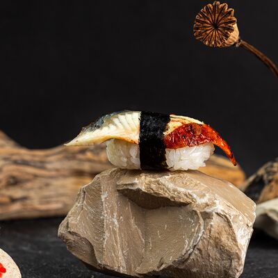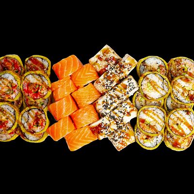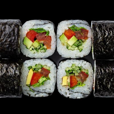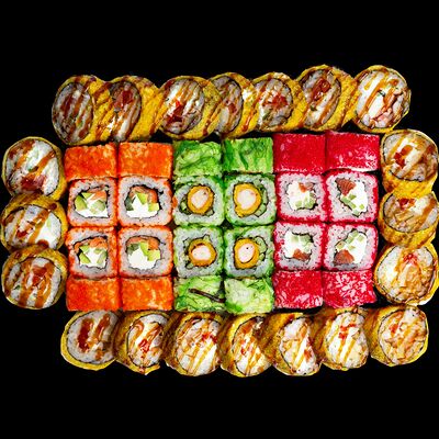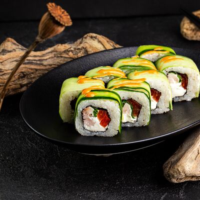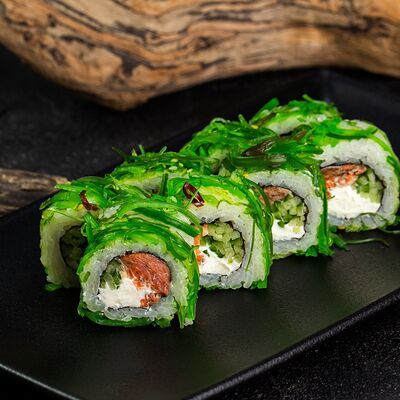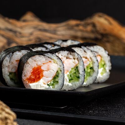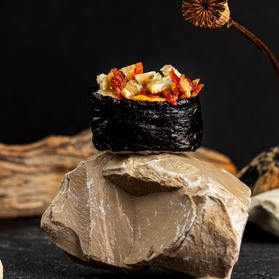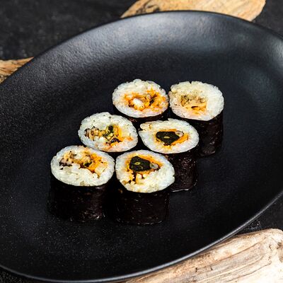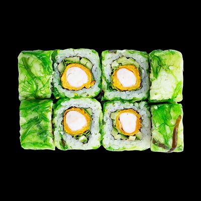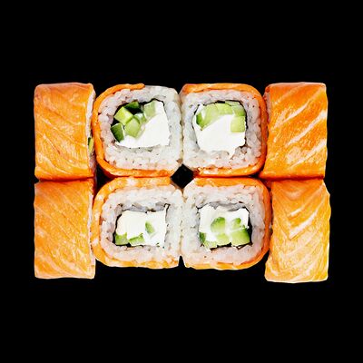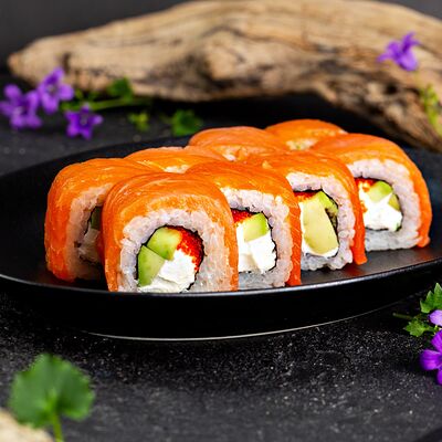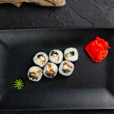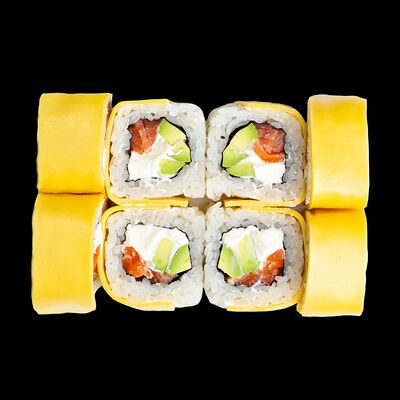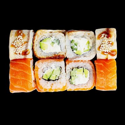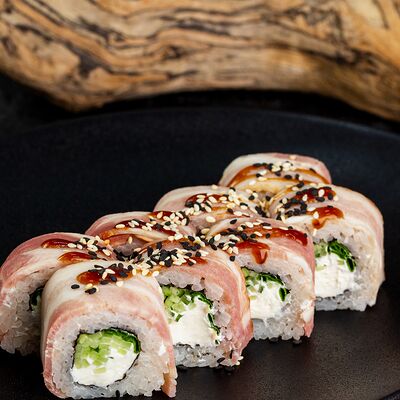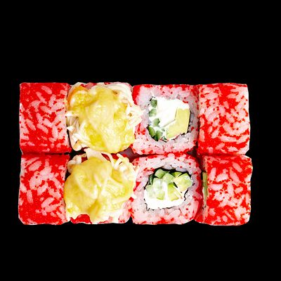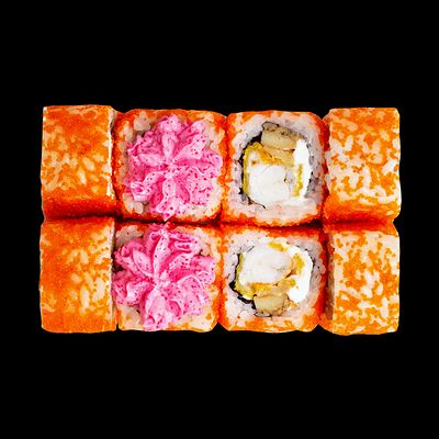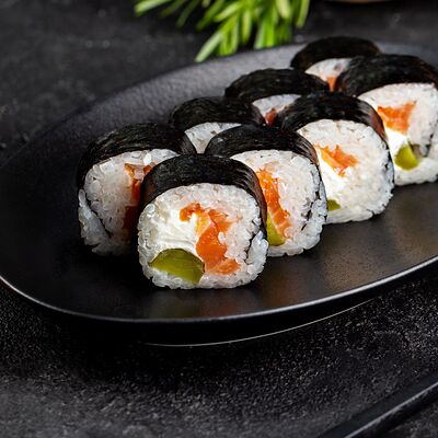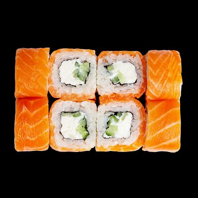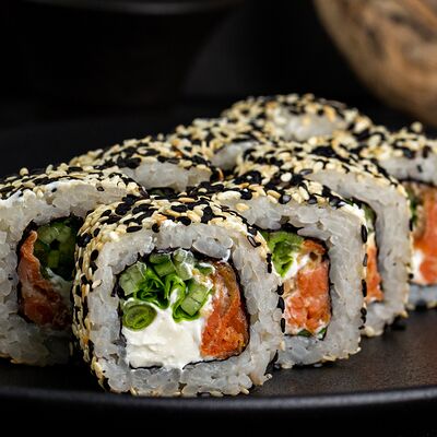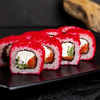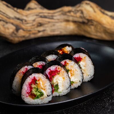 Рис, нори, сыр, авокадо, лосось слабосоленый, унаги-соус, кляр, сухари