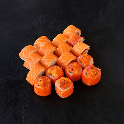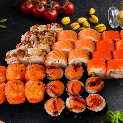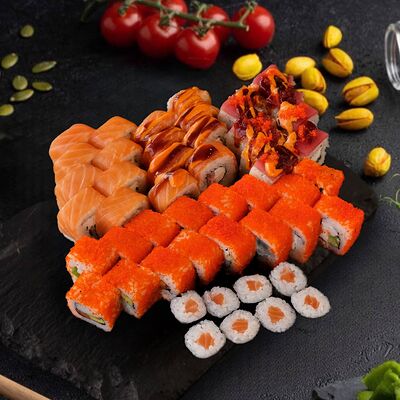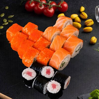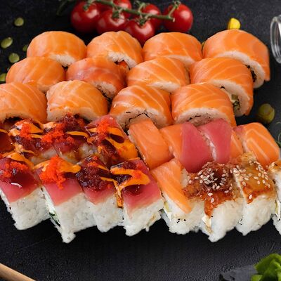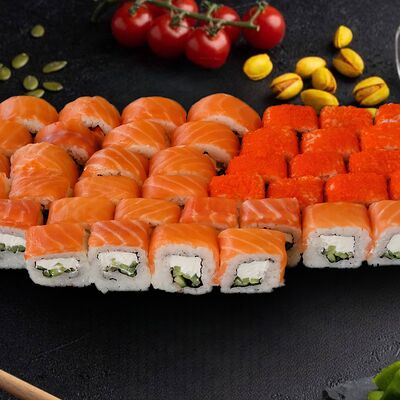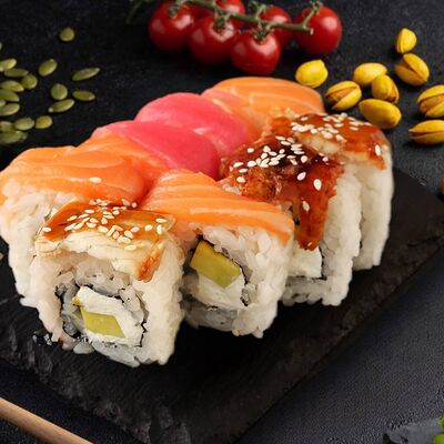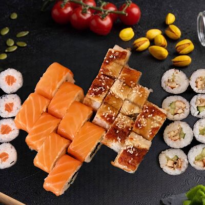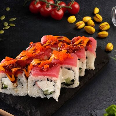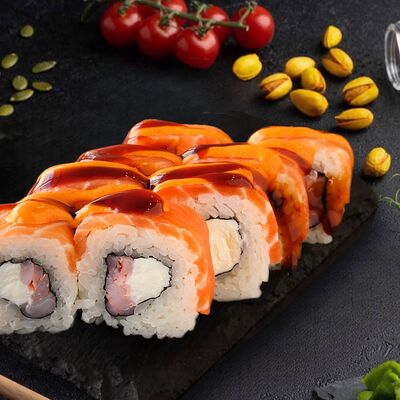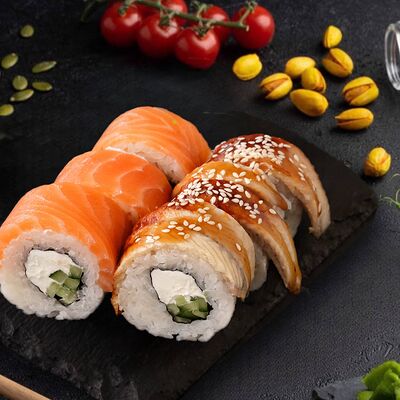 Филадельфия с копченным угрем, красный ламбо-ролл с татаки