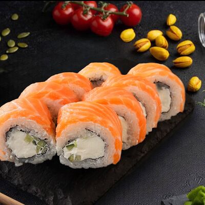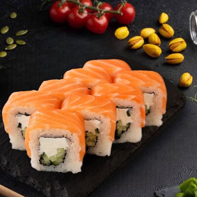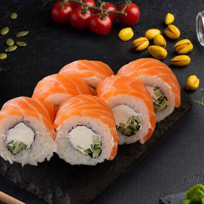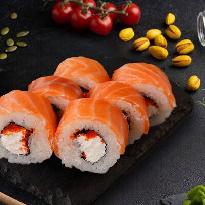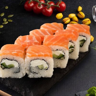 Много в роллах лосося Филадельфия Премиум