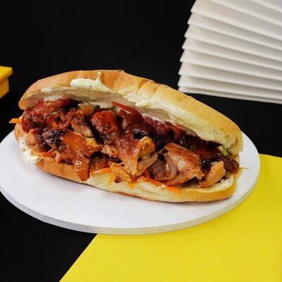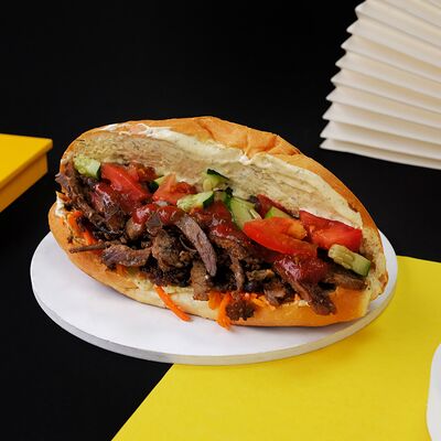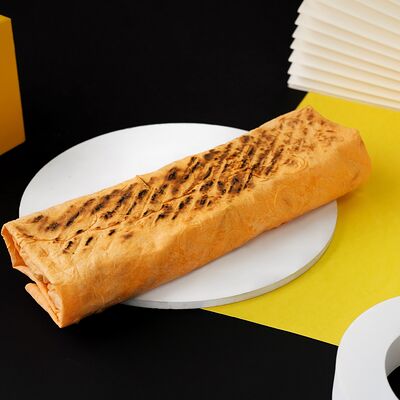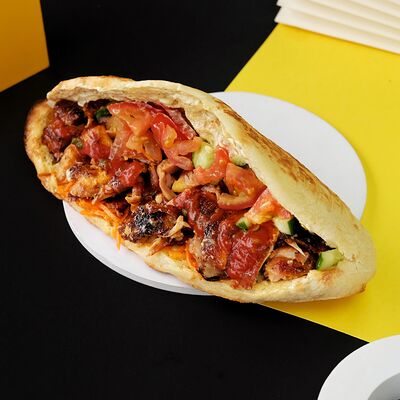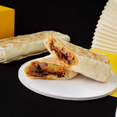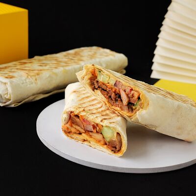 Тонкий лаваш, курица, свежие огурцы и помидоры, морковь по-корейски, соус скарлет и бланко