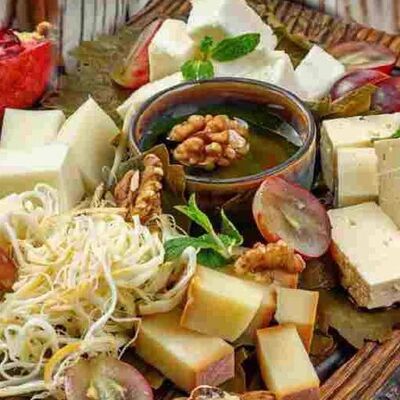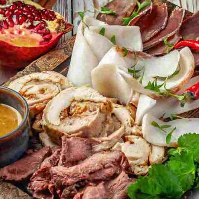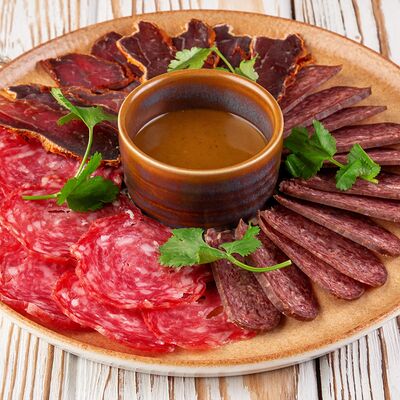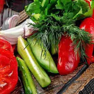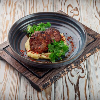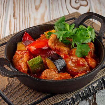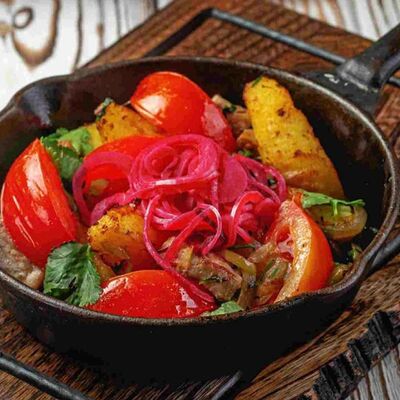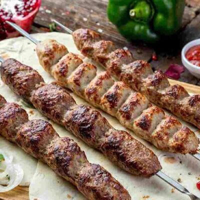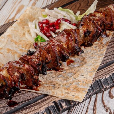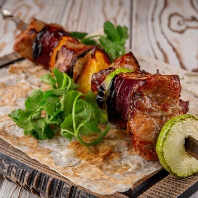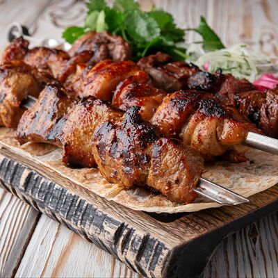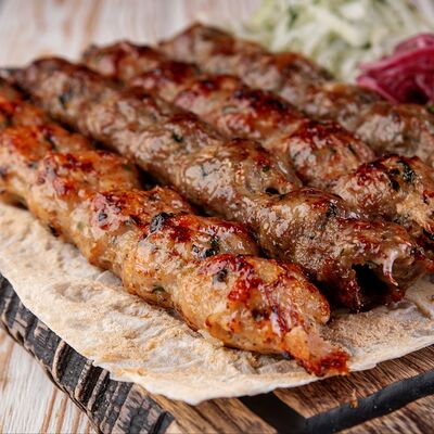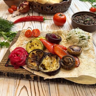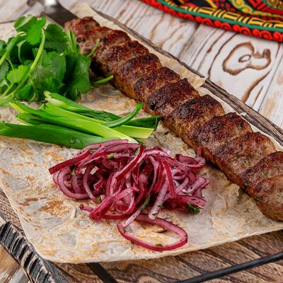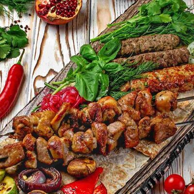 Ассорти шашлыка (свинина, курица), люля из свинины и говядины, люля из курицы, люля из баранины, овощи гриль (перец болгарский, кабачок, лук красный, баклажан), маринованный лук, зелень