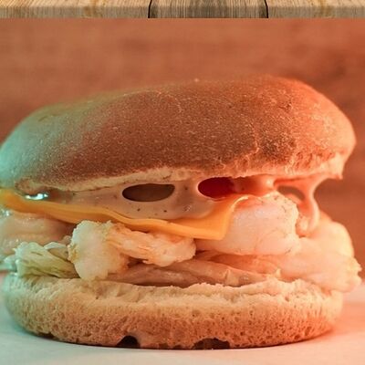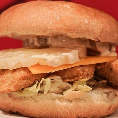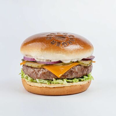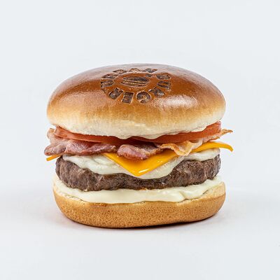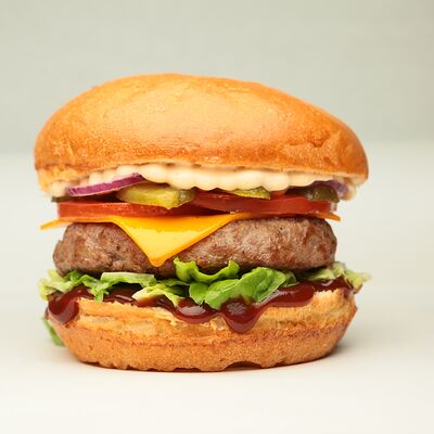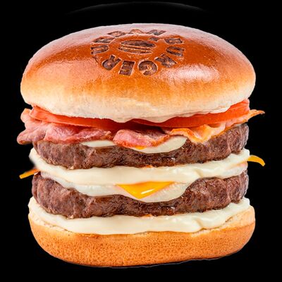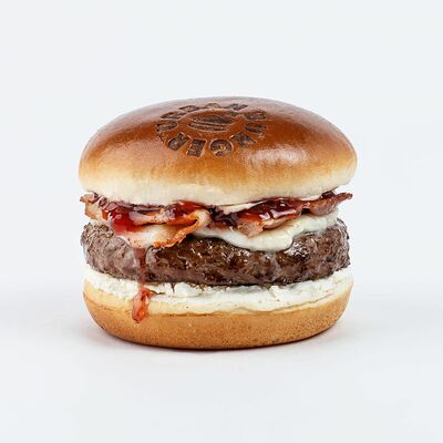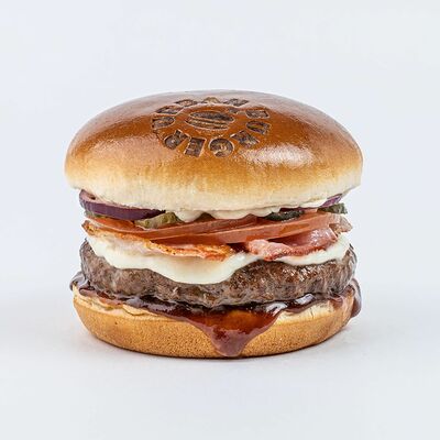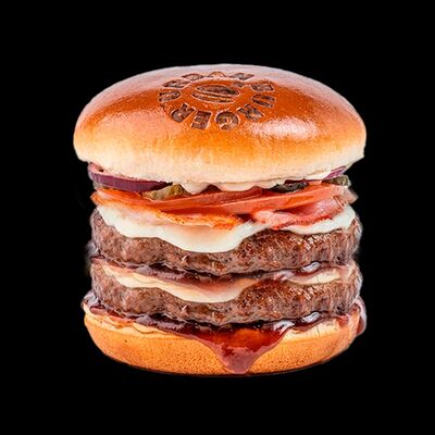 Булочка бриошь, большая котлета из мраморной говядины, сыр чеддер, жареный бекон, свежие томаты, сыр моцарелла, сливочный сыр