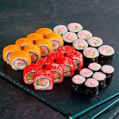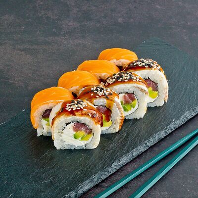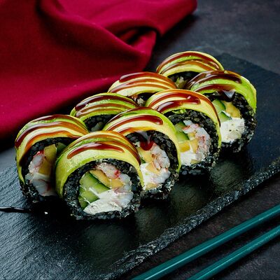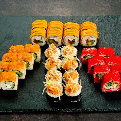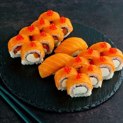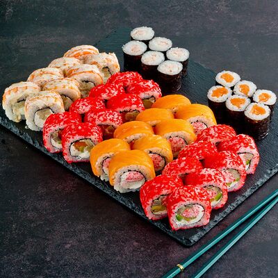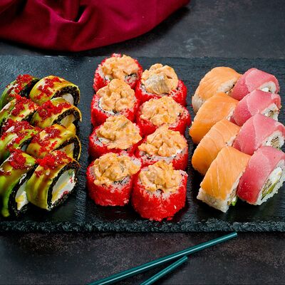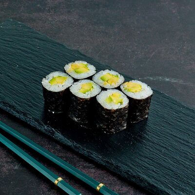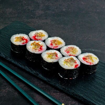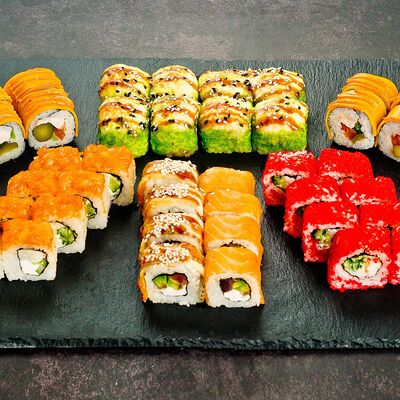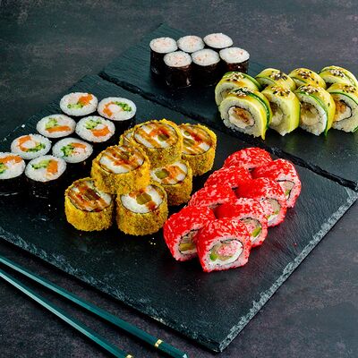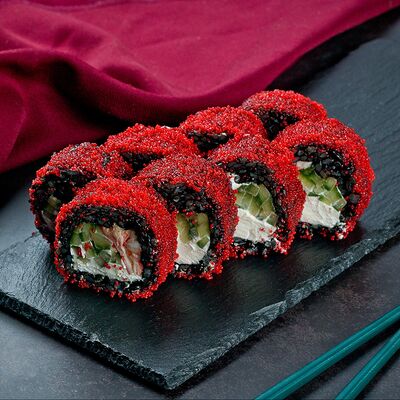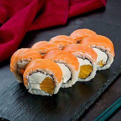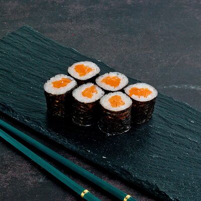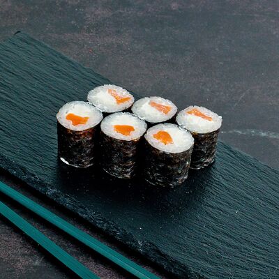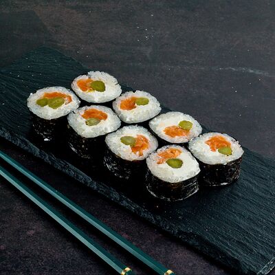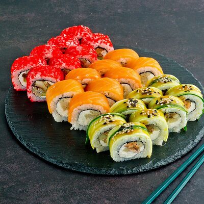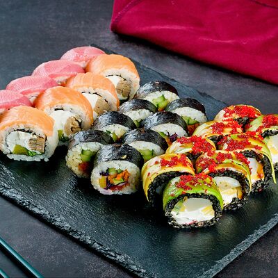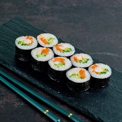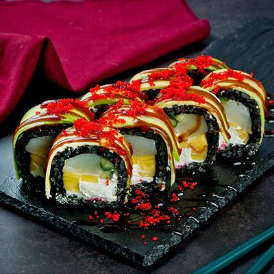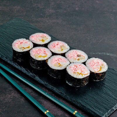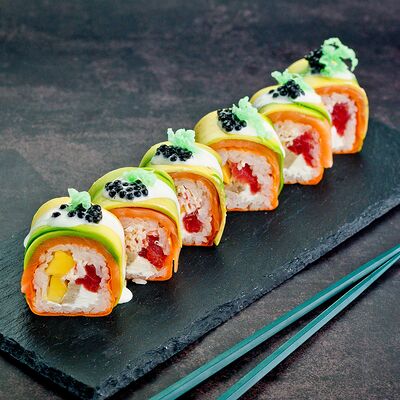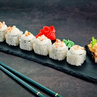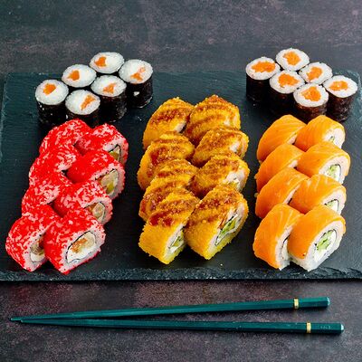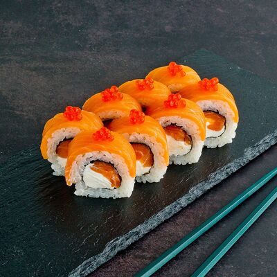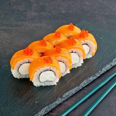 Рис, нори, лосось, авокадо, омлет (соевый соус, яйцо), масаго (используются свежие продукты высокого качества)