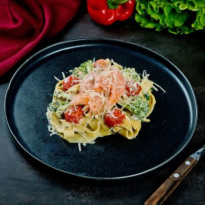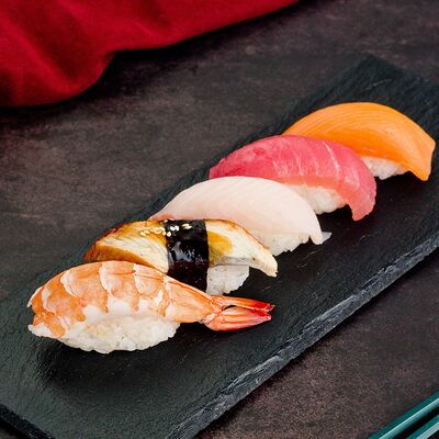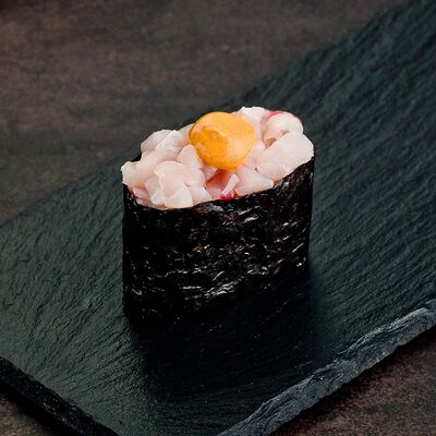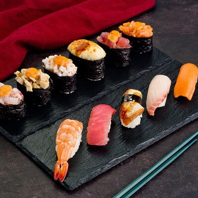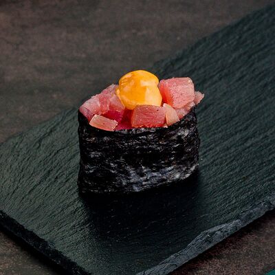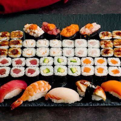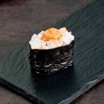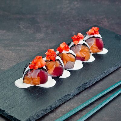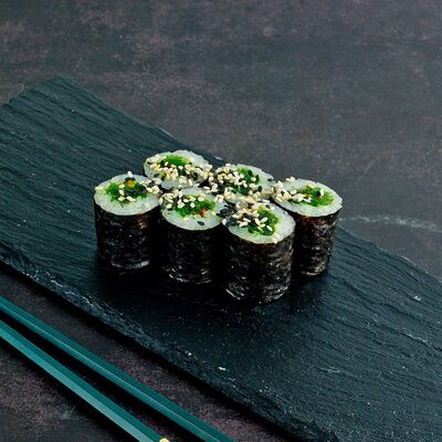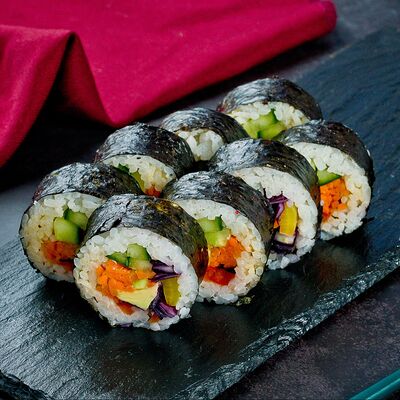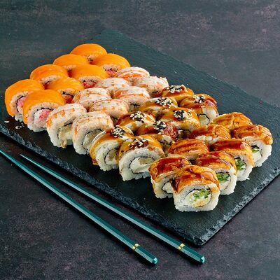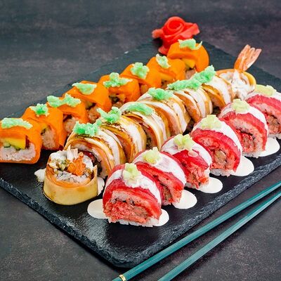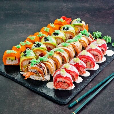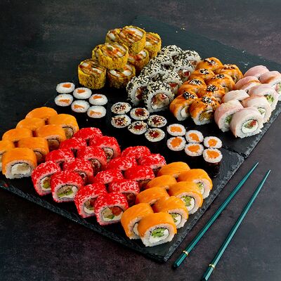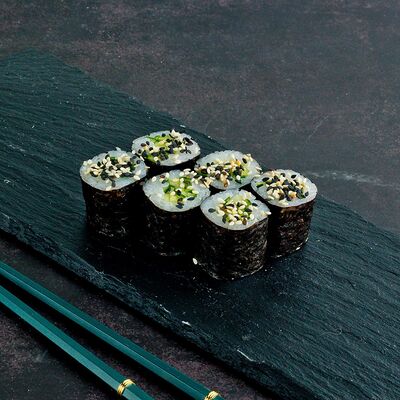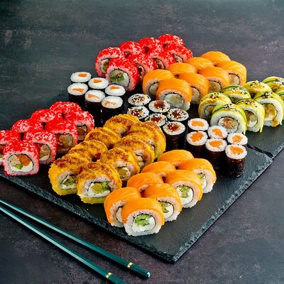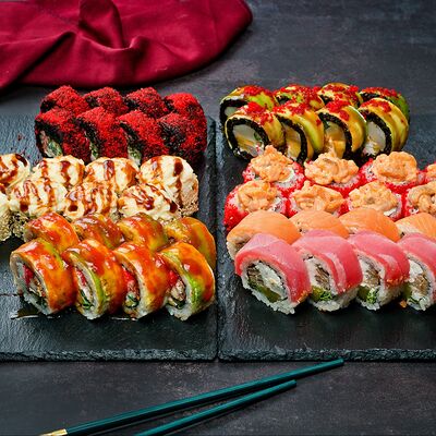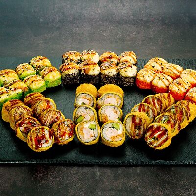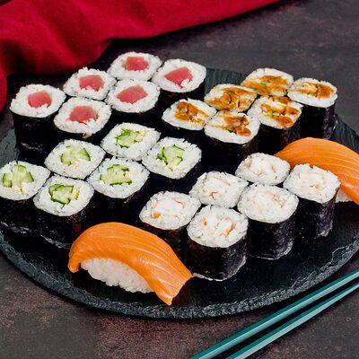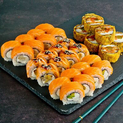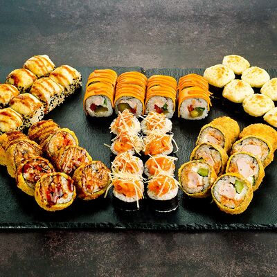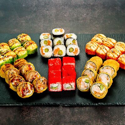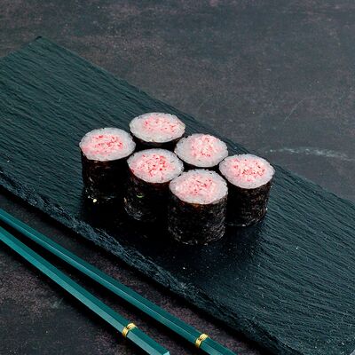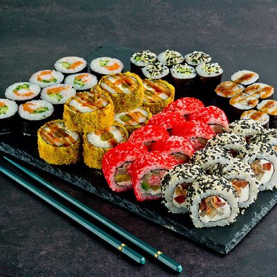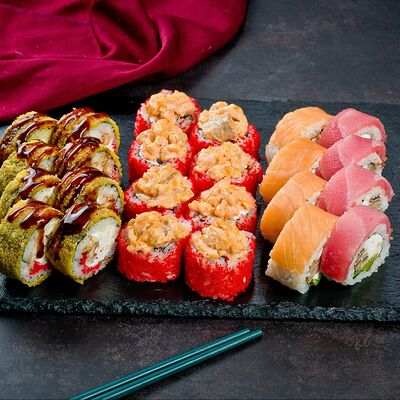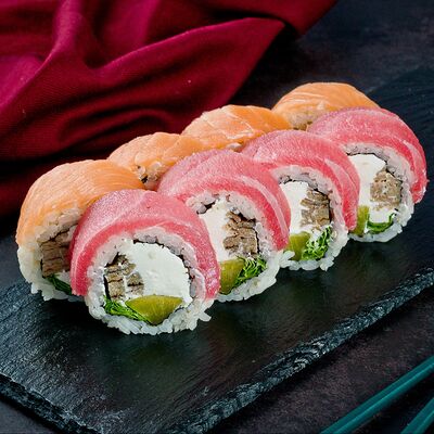 Рис, нори, лосось, авокадо, омлет (соевый соус, яйцо), масаго (используются свежие продукты высокого качества)