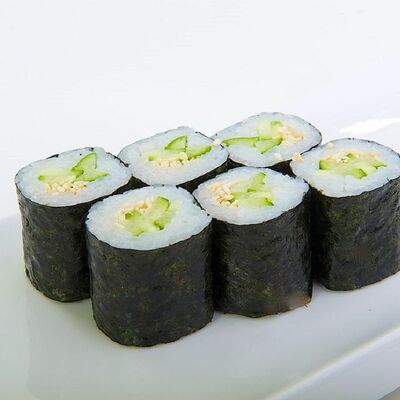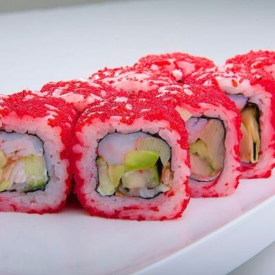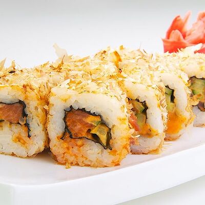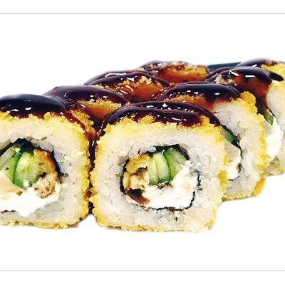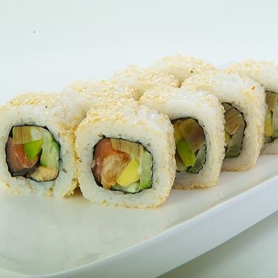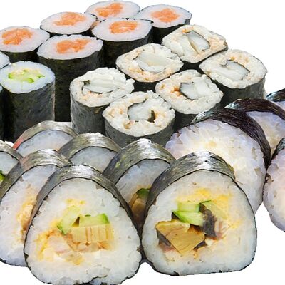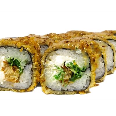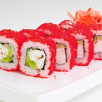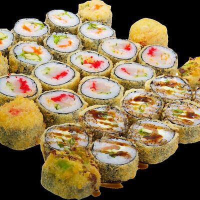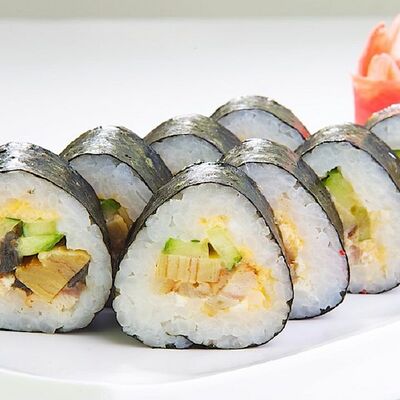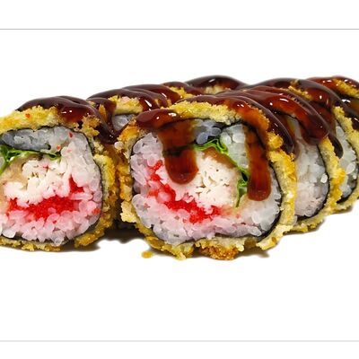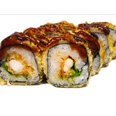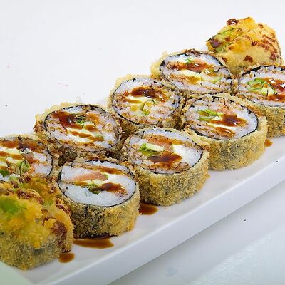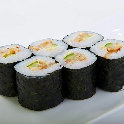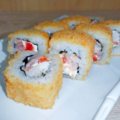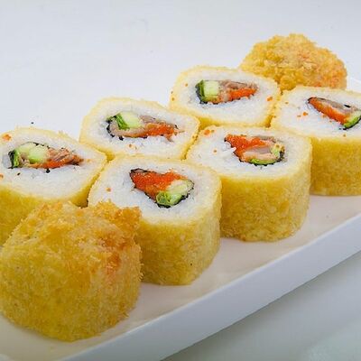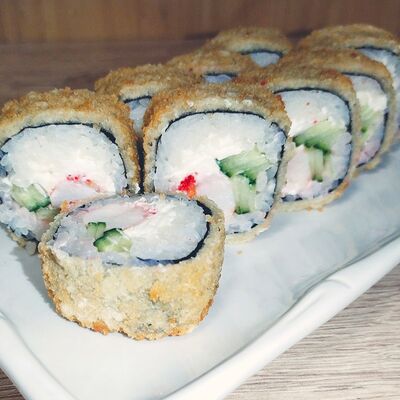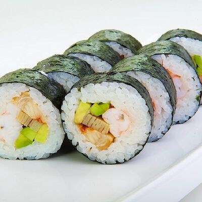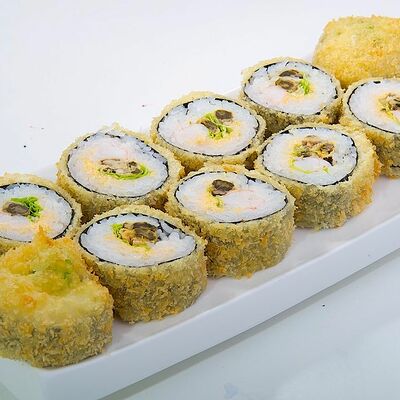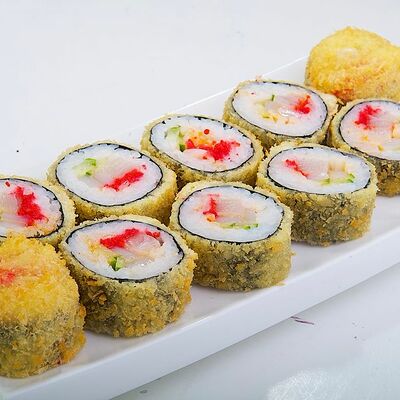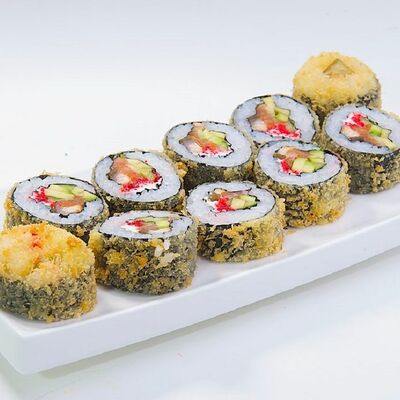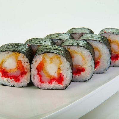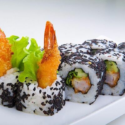 Креветка в кляре, салат, огурец, острый соус, рис, нори