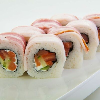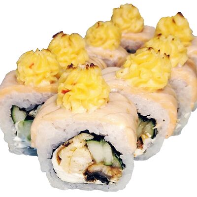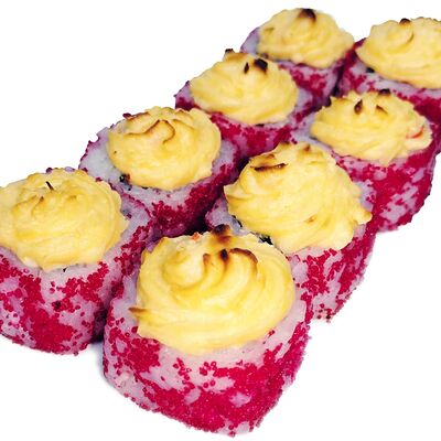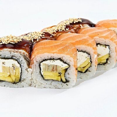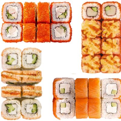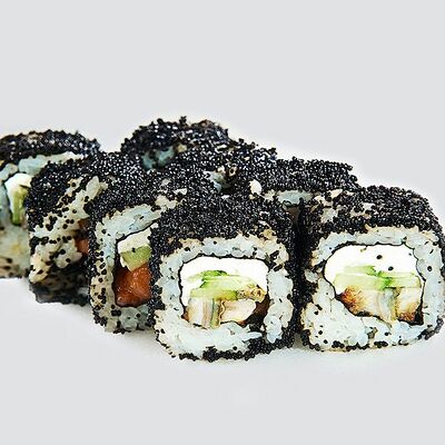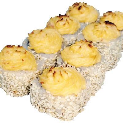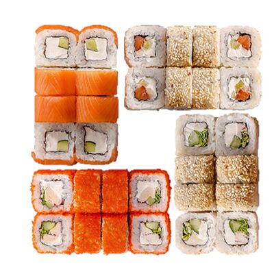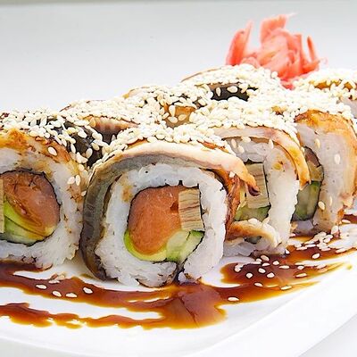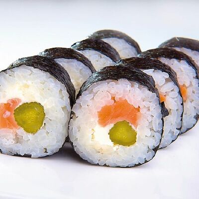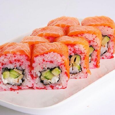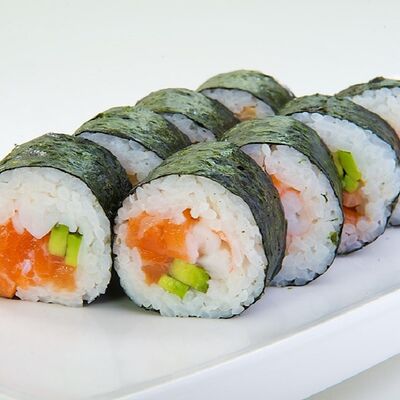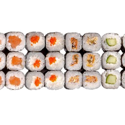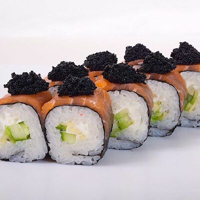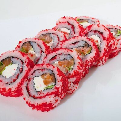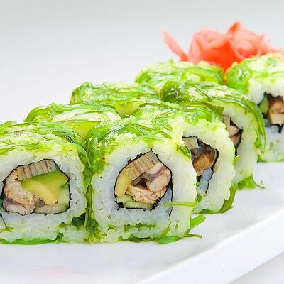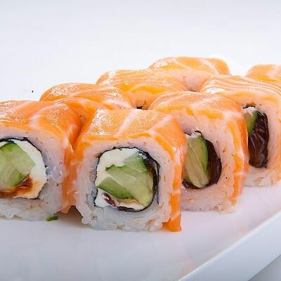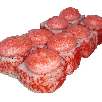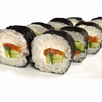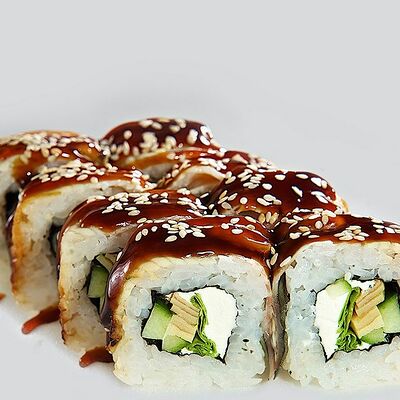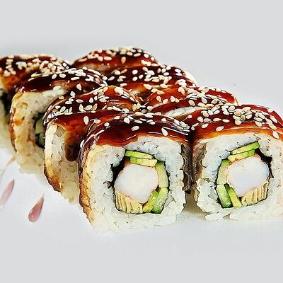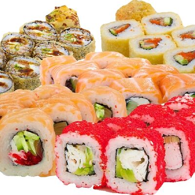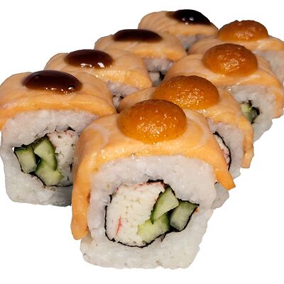 Креветка в кляре, салат, огурец, острый соус, рис, нори