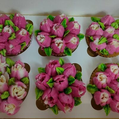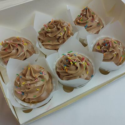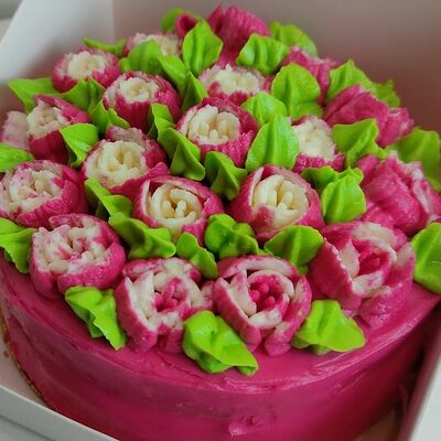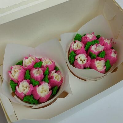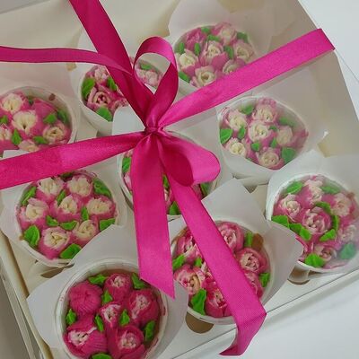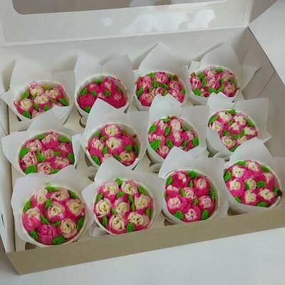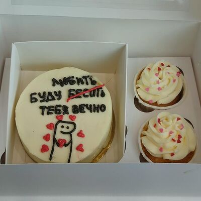 Мука, сахар, яйцо, молоко, ванильный сахар, соль, разрыхлитель, масло сливочное, творожный сыр, сахарная пудра, пищевой краситель (6 шт.)