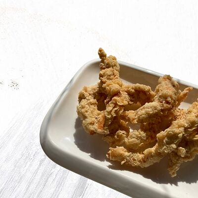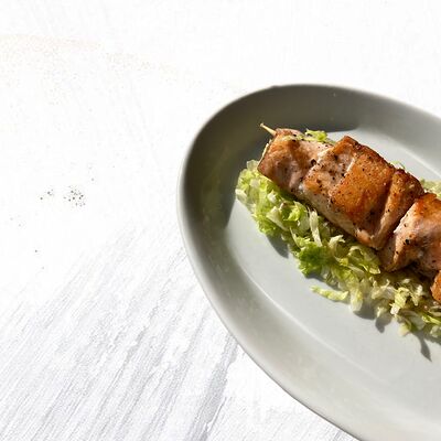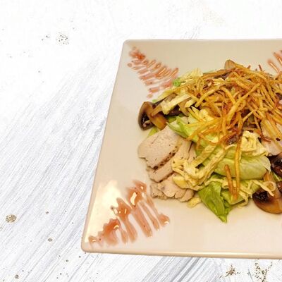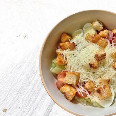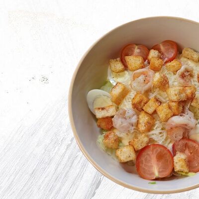 Креветки, сыр пармезан, салат айсберг, соус Цезарь, томат черри, перепелиное яйцо, сухарики