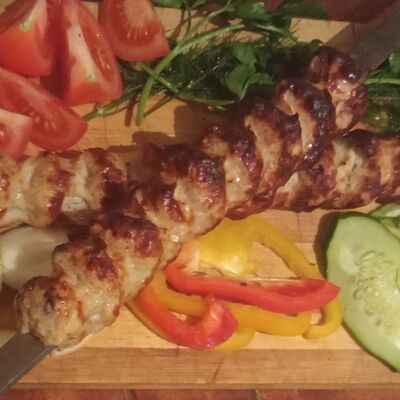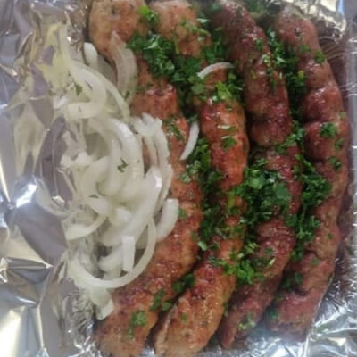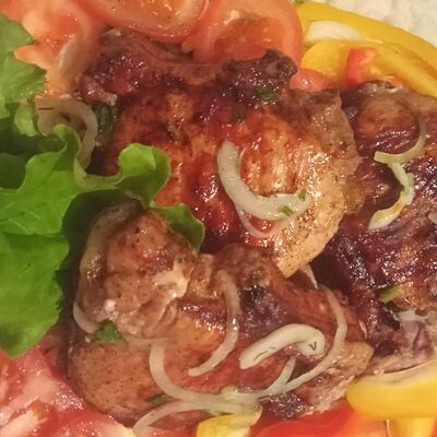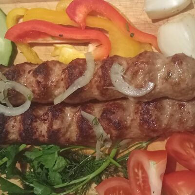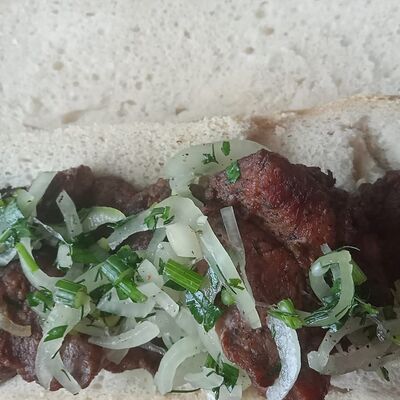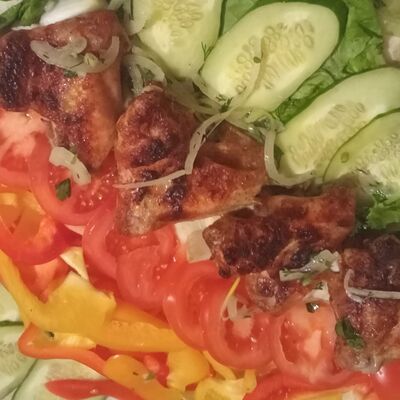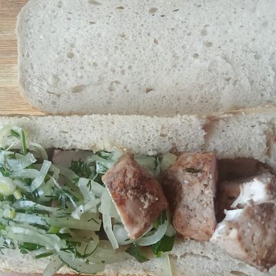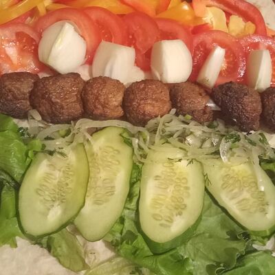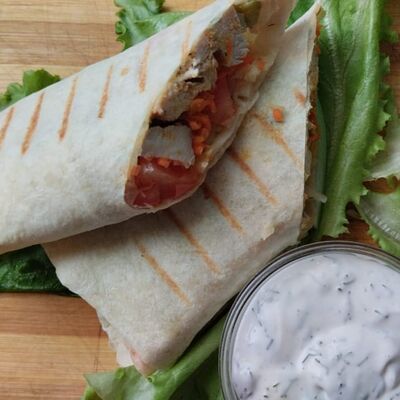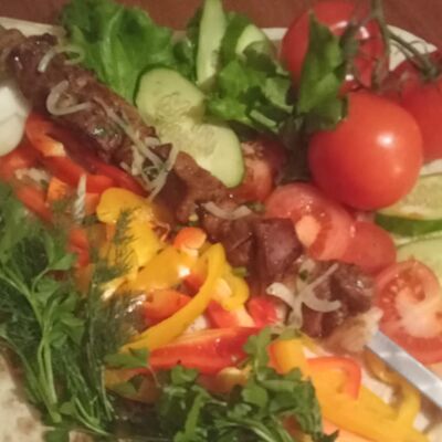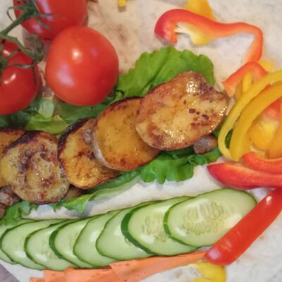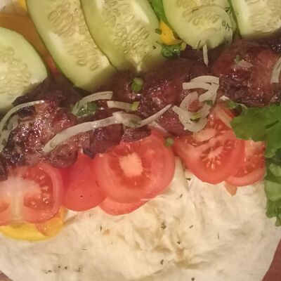 Шаурма из свинины, корейская морковь, соленые огурцы, капуста, помидоры, лук, соус