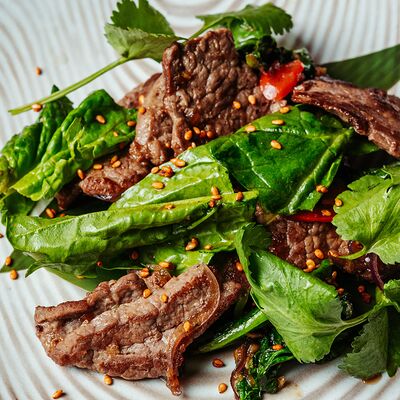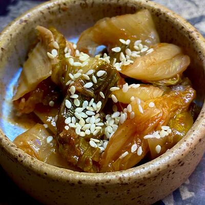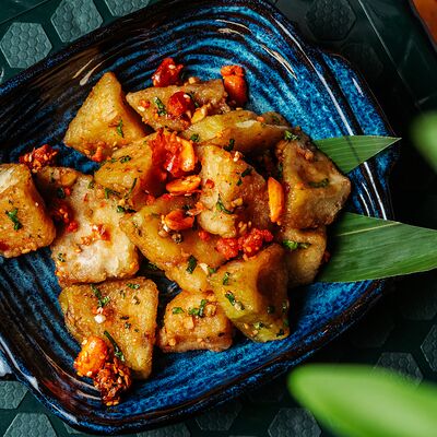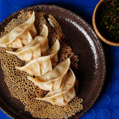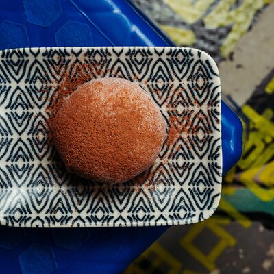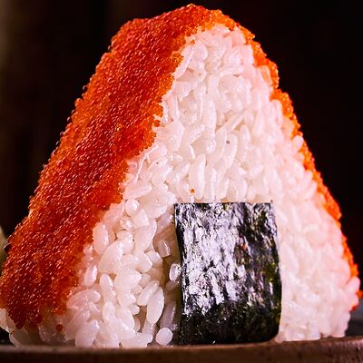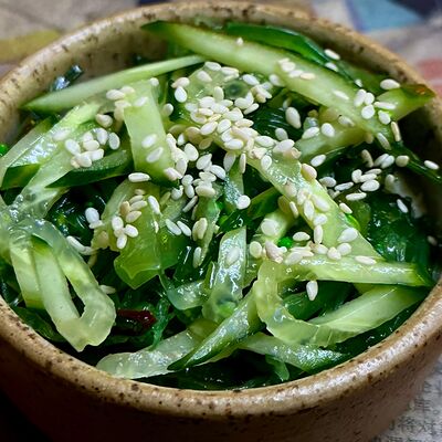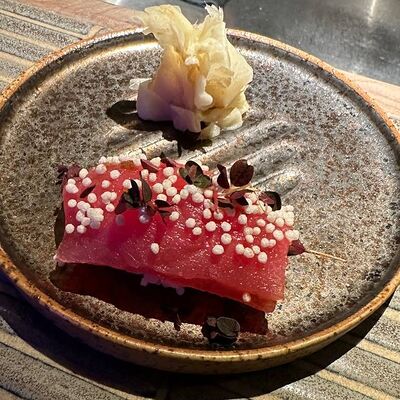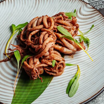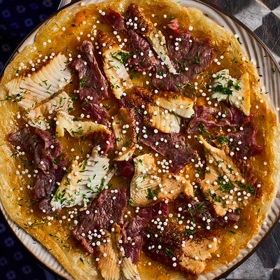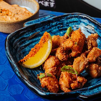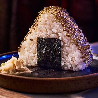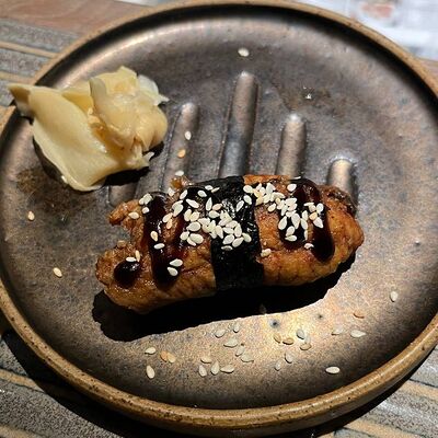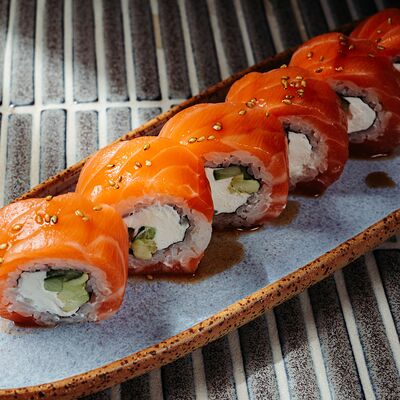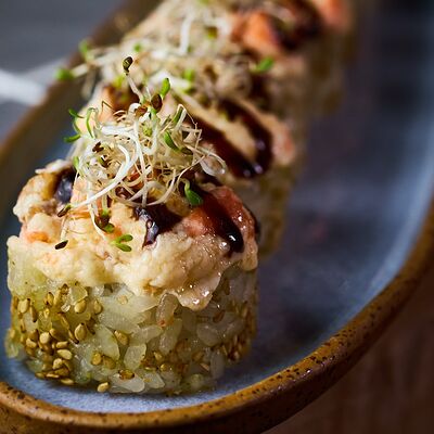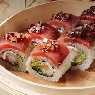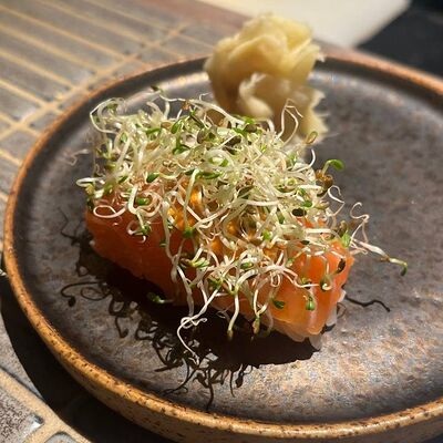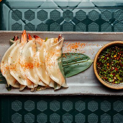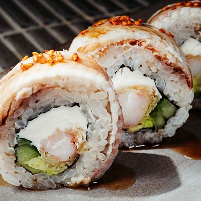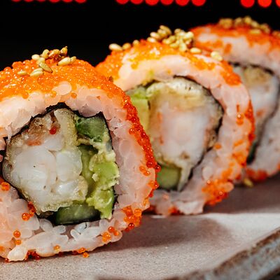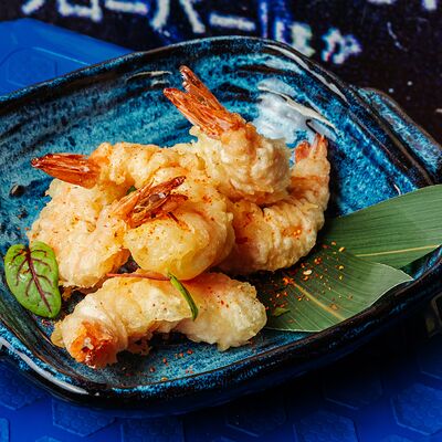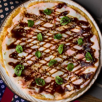 Кунжутная лепешка, креветки, авокадо, соус темпура, микрозелень