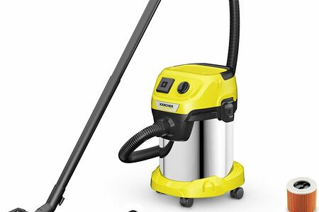 Экстра-мощный хозяйственный мультифункциональный пылесос KARCHER WD 3 подходит для уборки сухого и влажного, мелкого и крупного мусора как в быту, так и в мастерской. На корпусе предусмотрена розетка для электроинструмента, при включении которого, пылесос автоматически начинает работать, собирать образующиеся стружки и пыль.