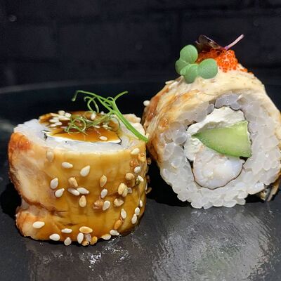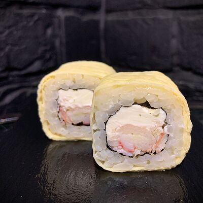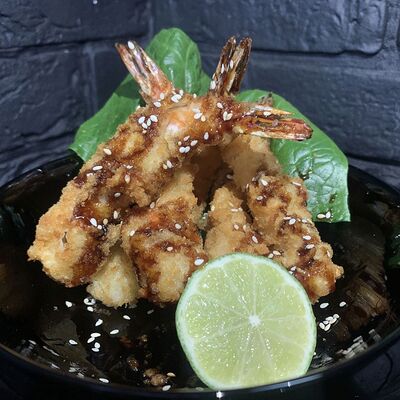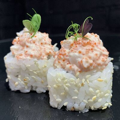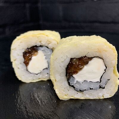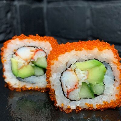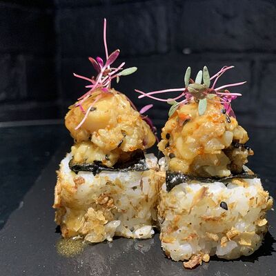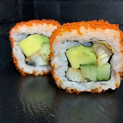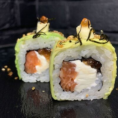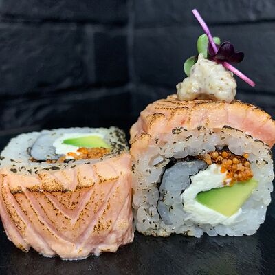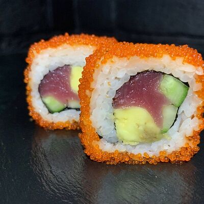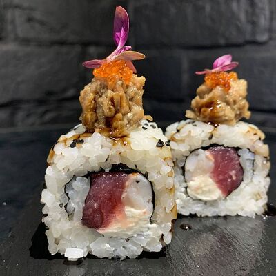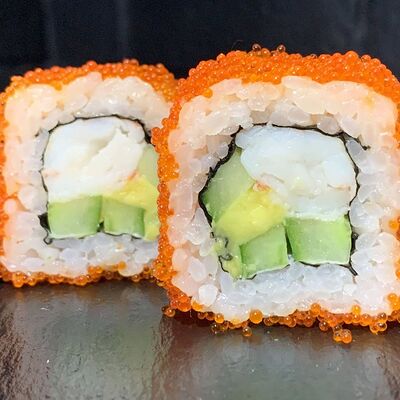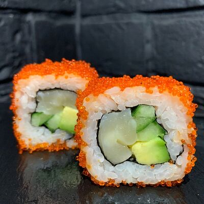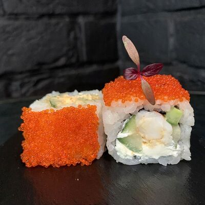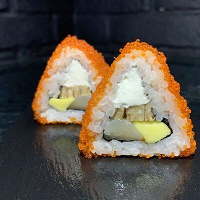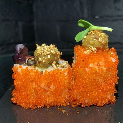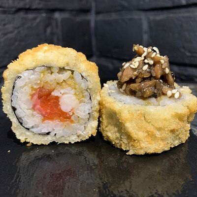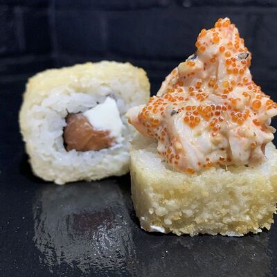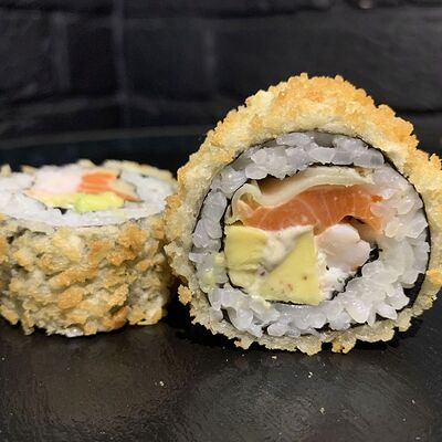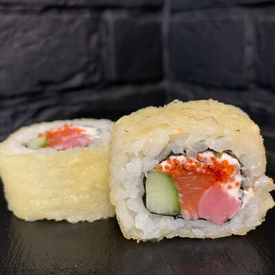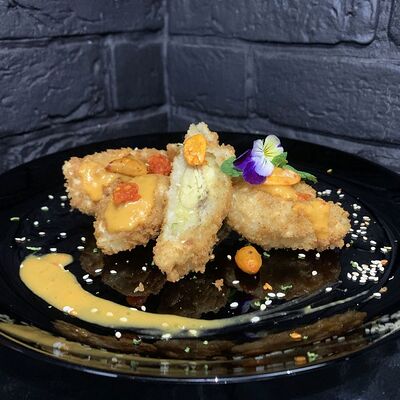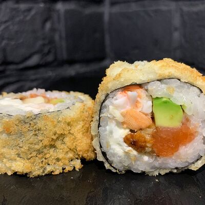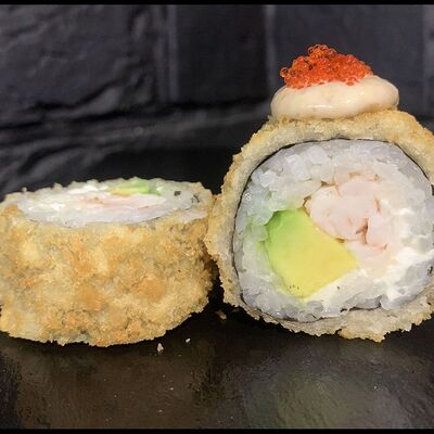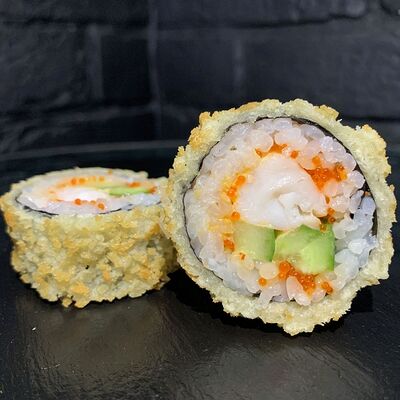 Жареный ролл во фритюре в японских сухариках панко с тигровой креветкой, спелым авокадо, икрой летучей рыбы (tobikko-sushi), сливочным крем-сыром, ореховым соусом (8 шт.)