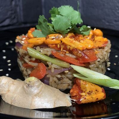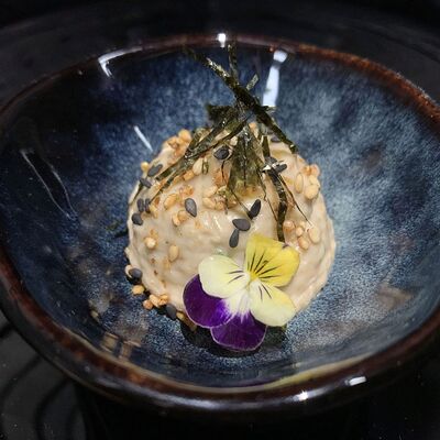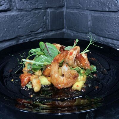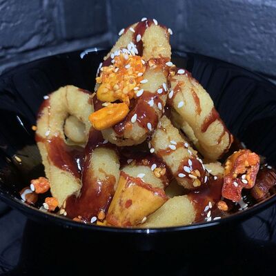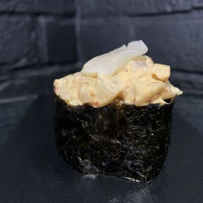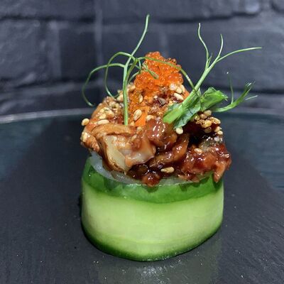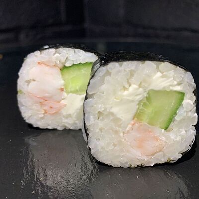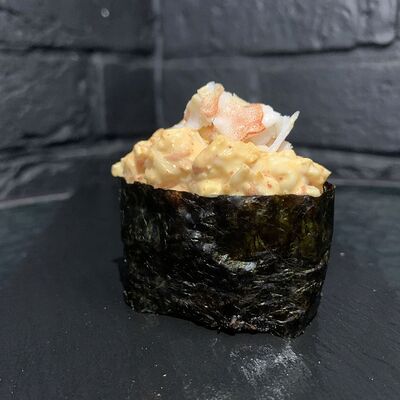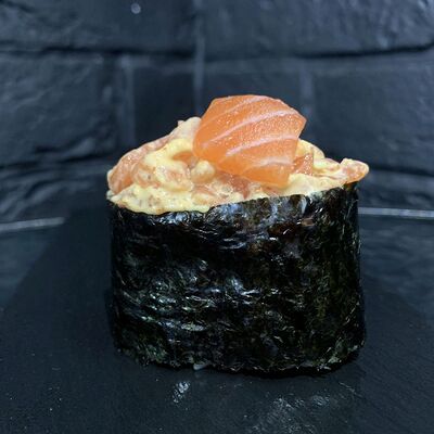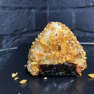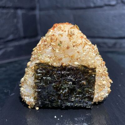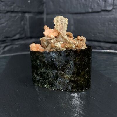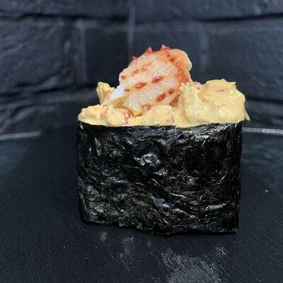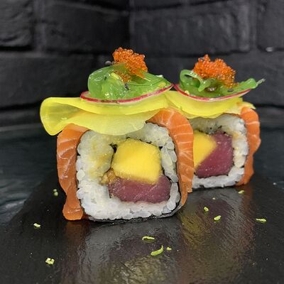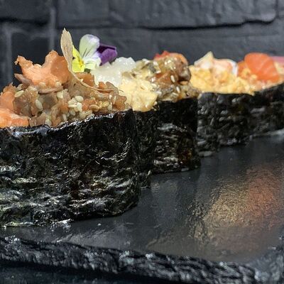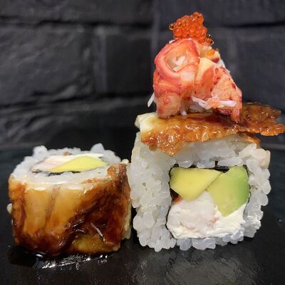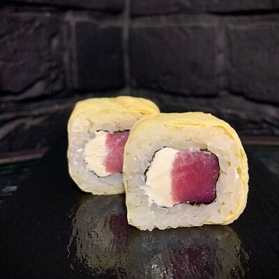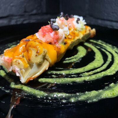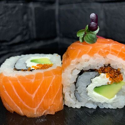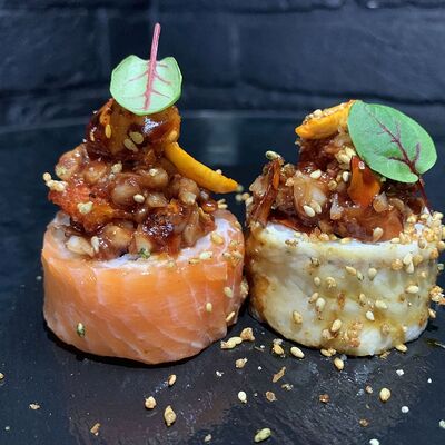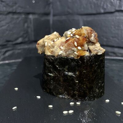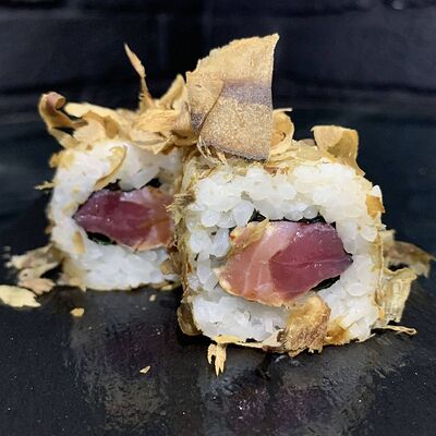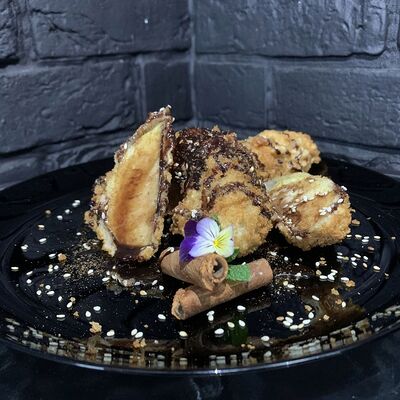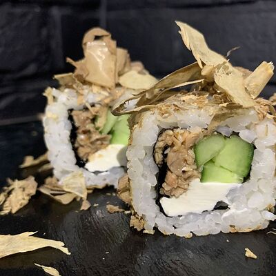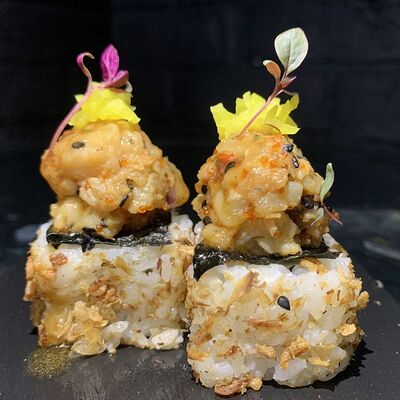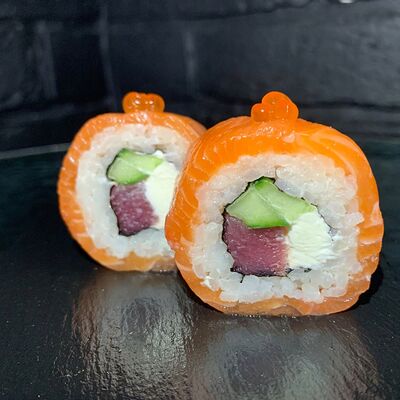 Жареный ролл во фритюре в японских сухариках панко с тигровой креветкой, спелым авокадо, икрой летучей рыбы (tobikko-sushi), сливочным крем-сыром, ореховым соусом (8 шт.)