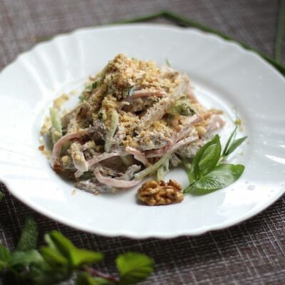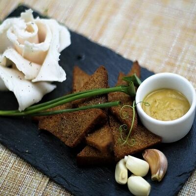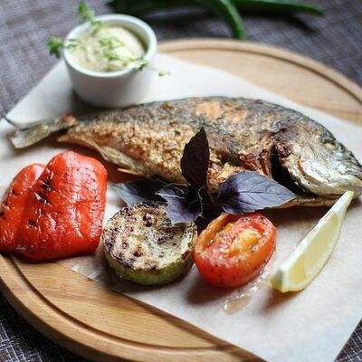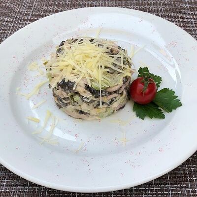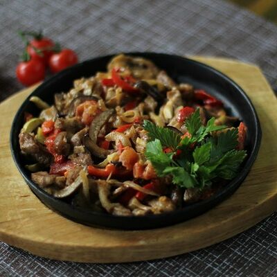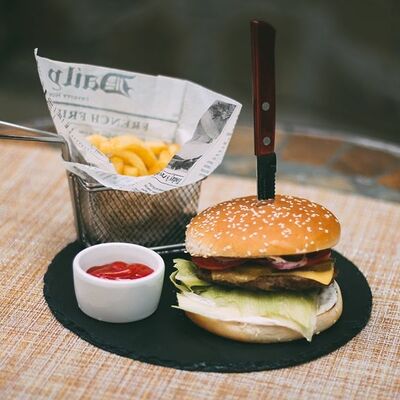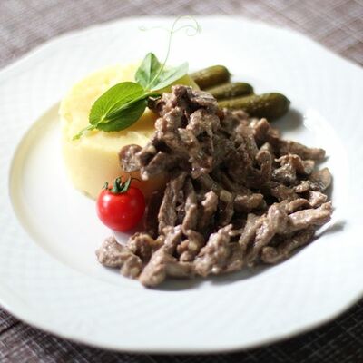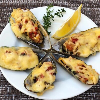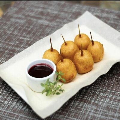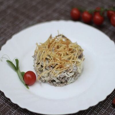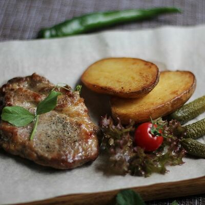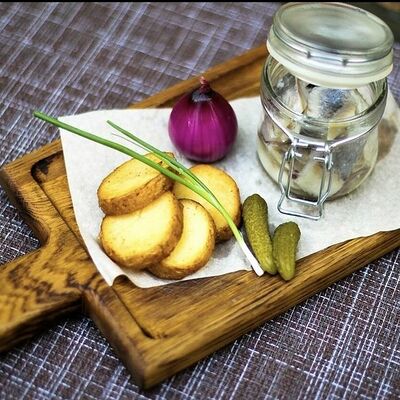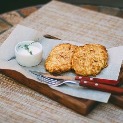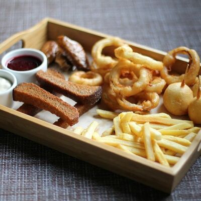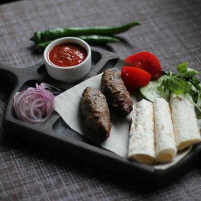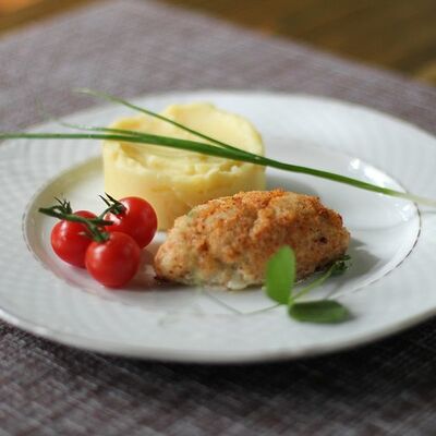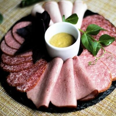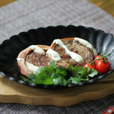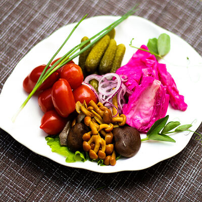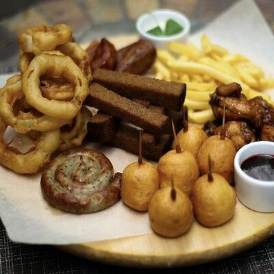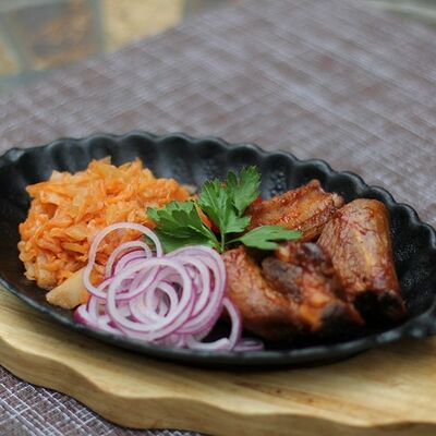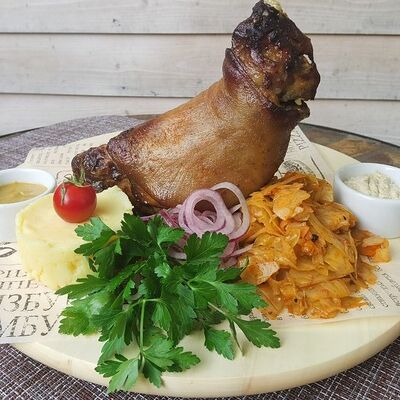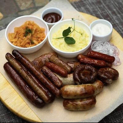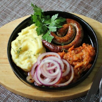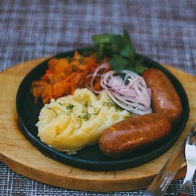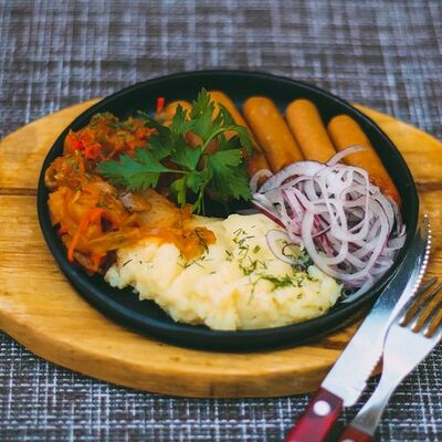 Колбаски из свинины и говядины с сыром, капуста тушеная, картофельное пюре, лук красный