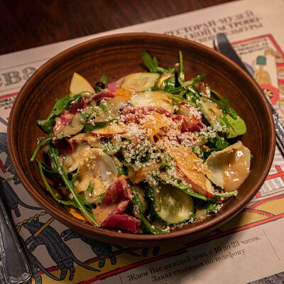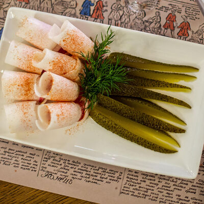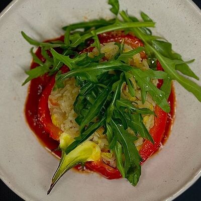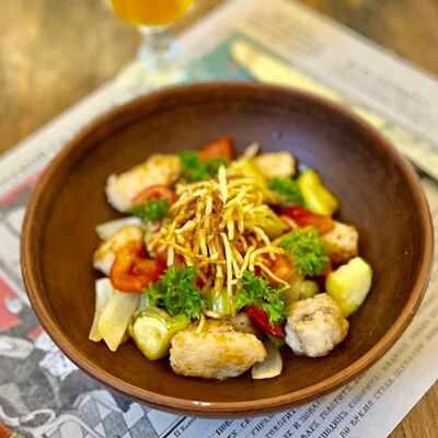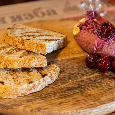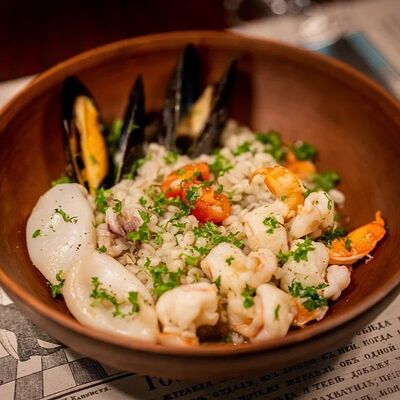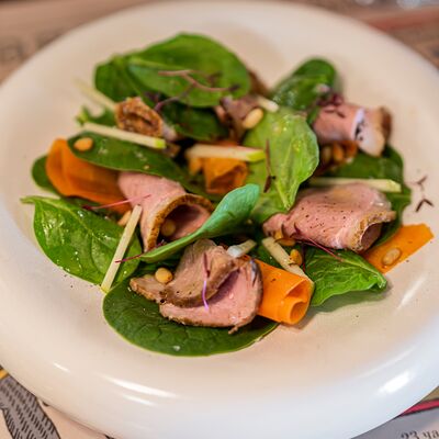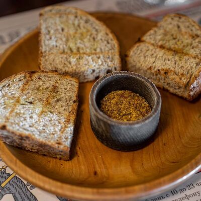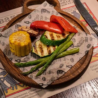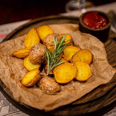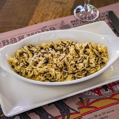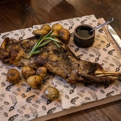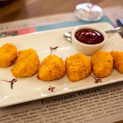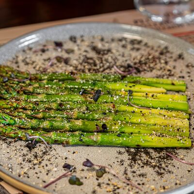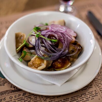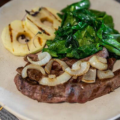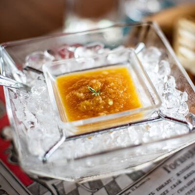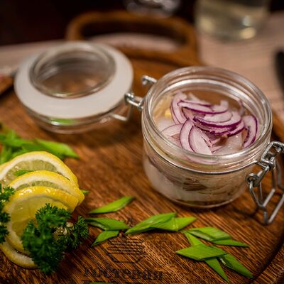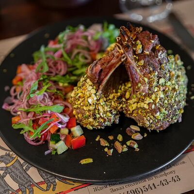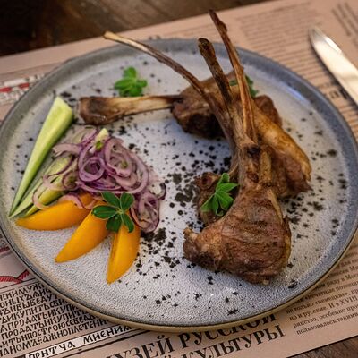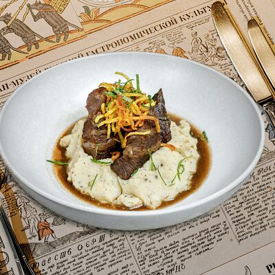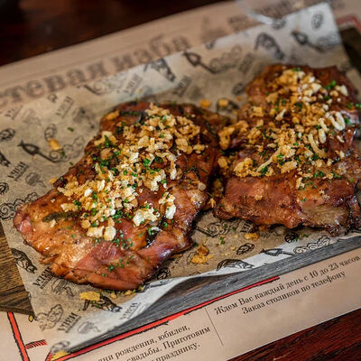 Ребра свиные, масло оливковое, соль морская, лук зеленый, розмарин, тимьян, лук фри, лук репка, чеснок, имбирь, бальзамический крем-соус, вино