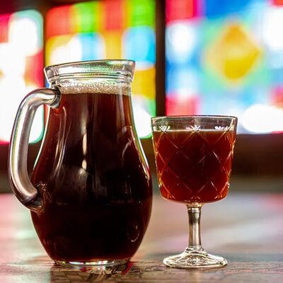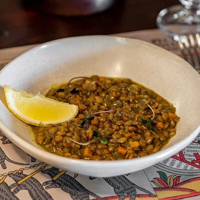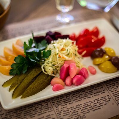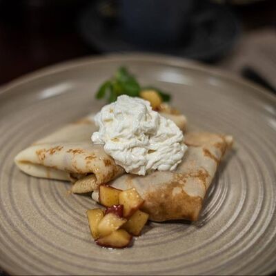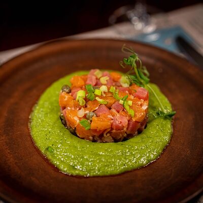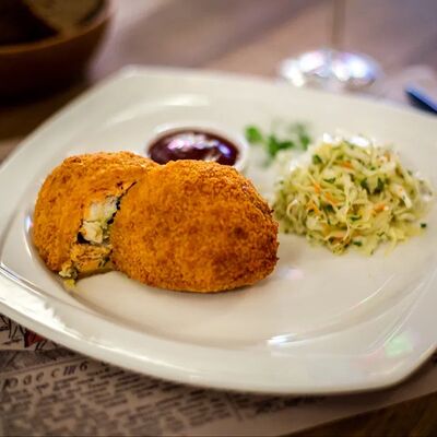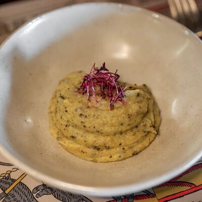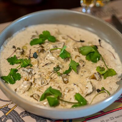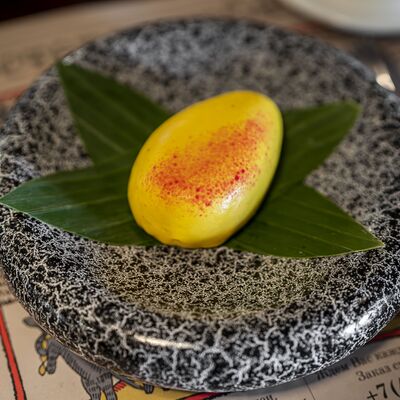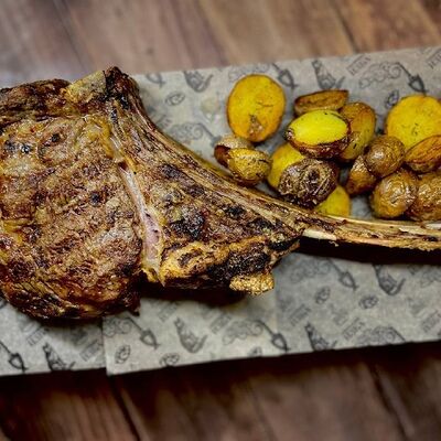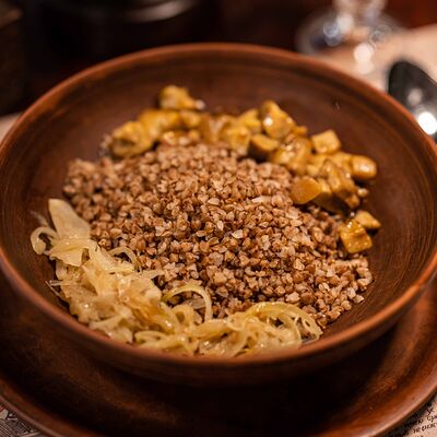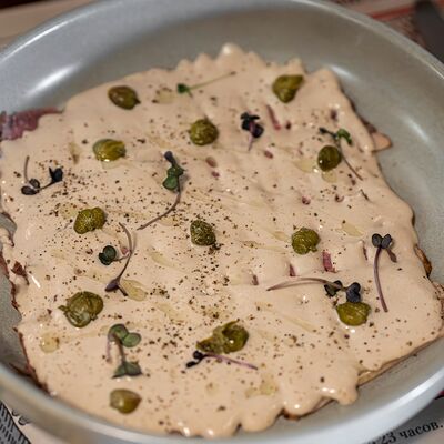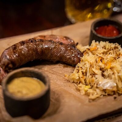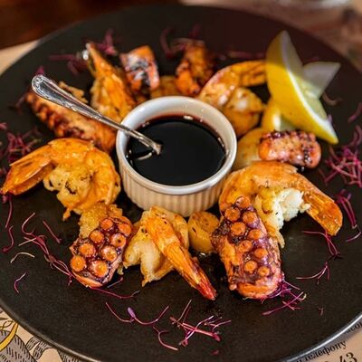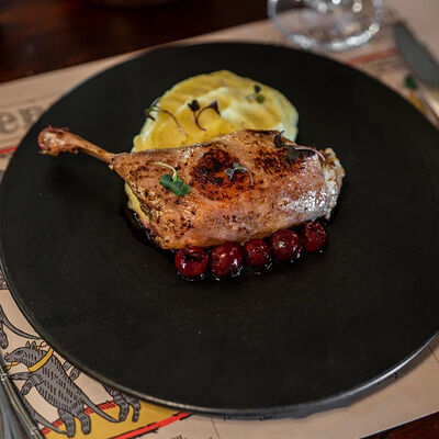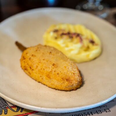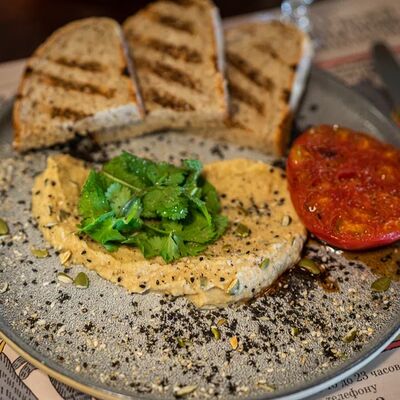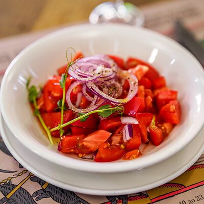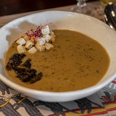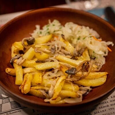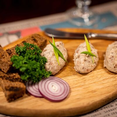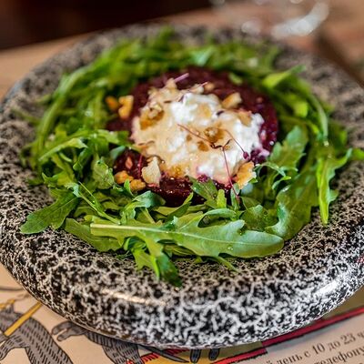 Ребра свиные, масло оливковое, соль морская, лук зеленый, розмарин, тимьян, лук фри, лук репка, чеснок, имбирь, бальзамический крем-соус, вино