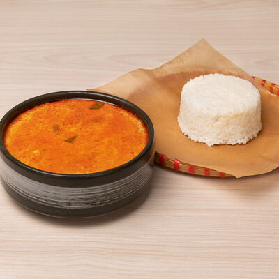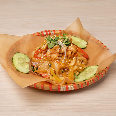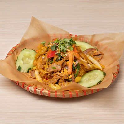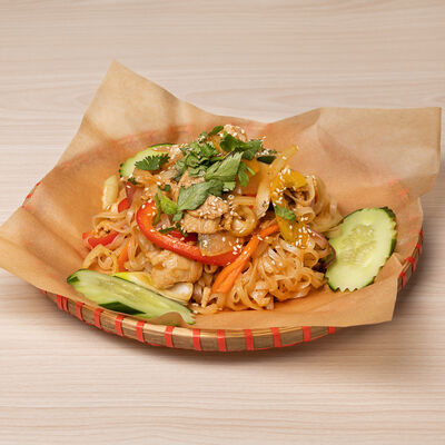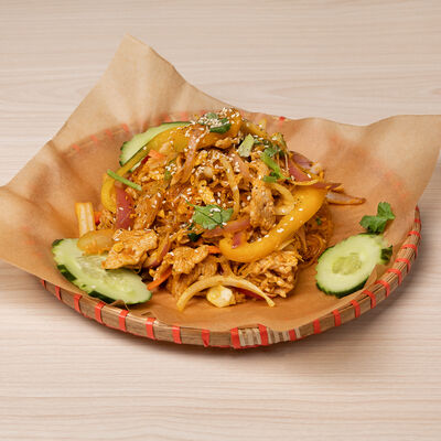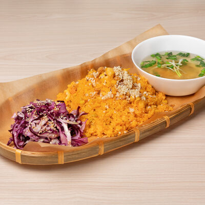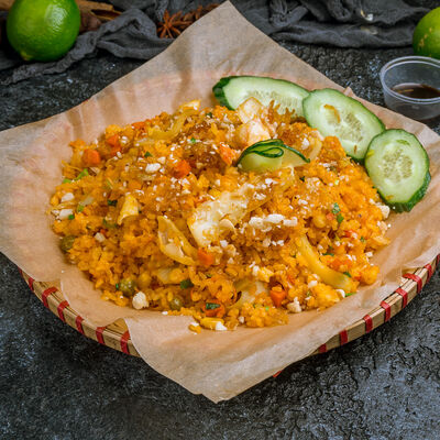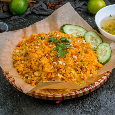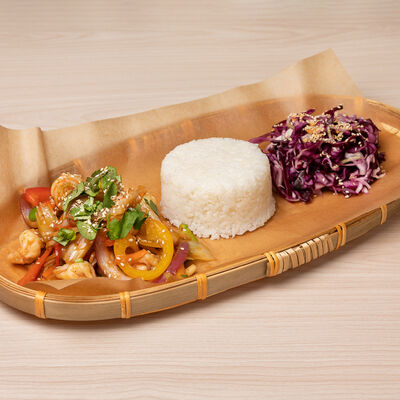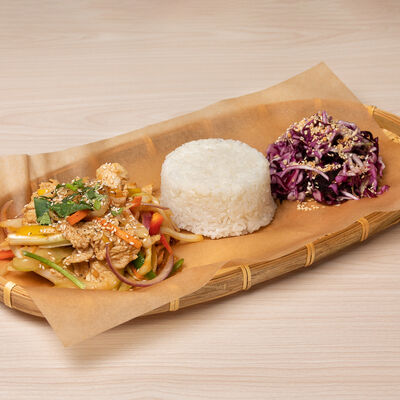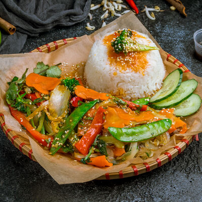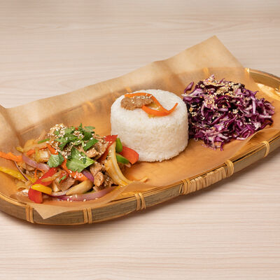 Паровой рис с обжаренной индейкой в специальном соусе, с цветной капустой, луком, морковью, сладким перцем, горохом