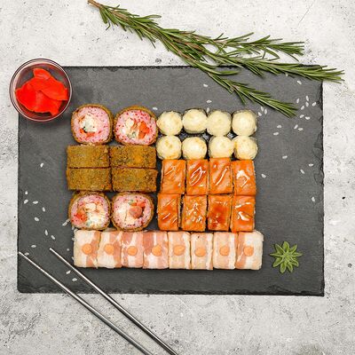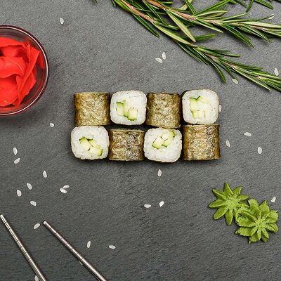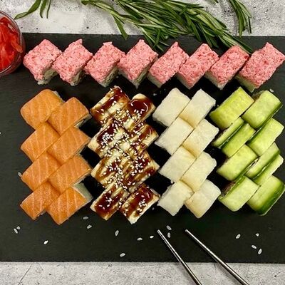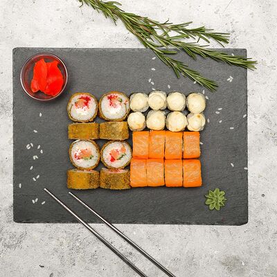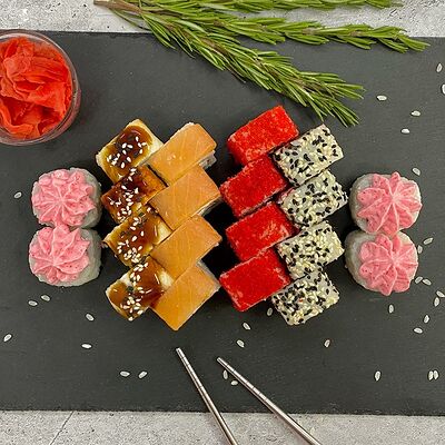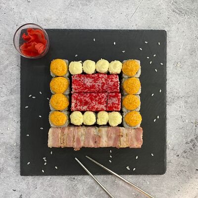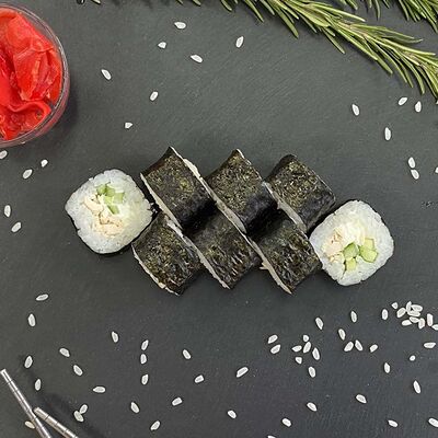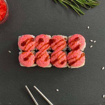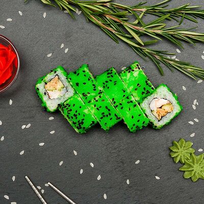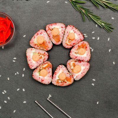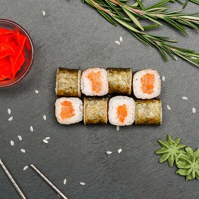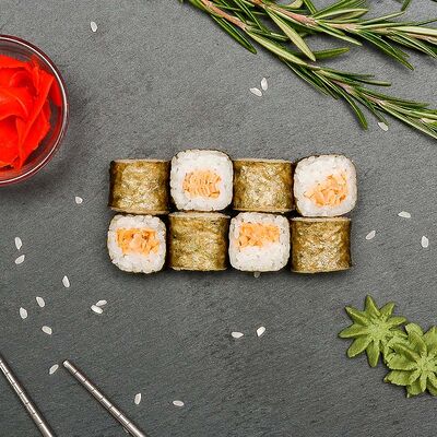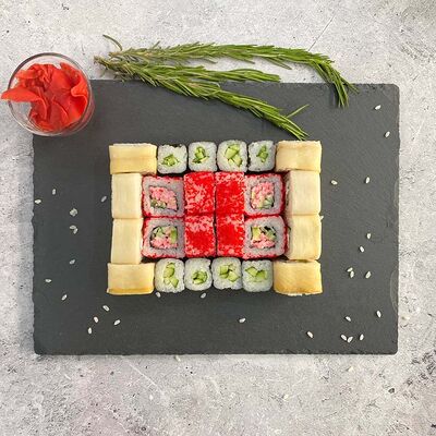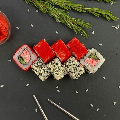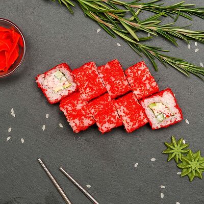 Рис, нори, лосось, огурец, авокадо, майонез, икра масаго (8 шт.). Соевый соус, имбирь, васаби в комплект не входят и приобретаются отдельно