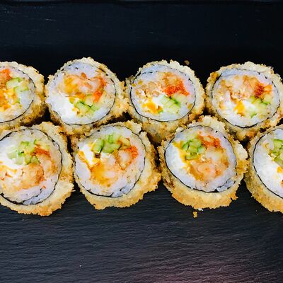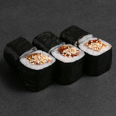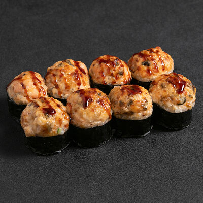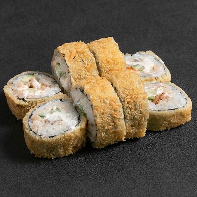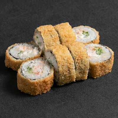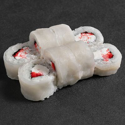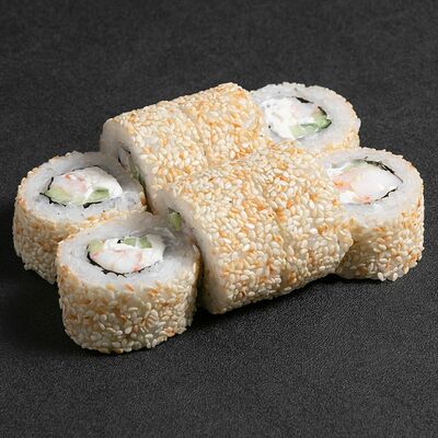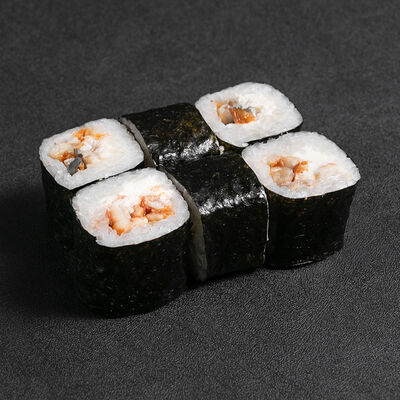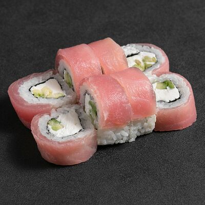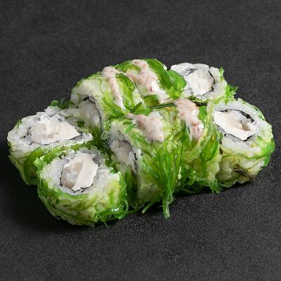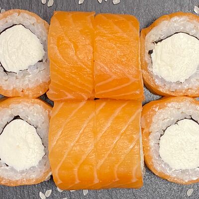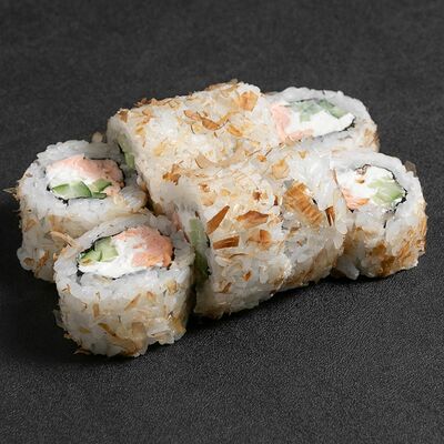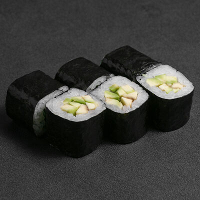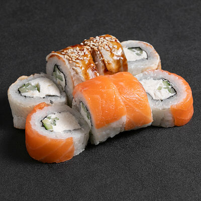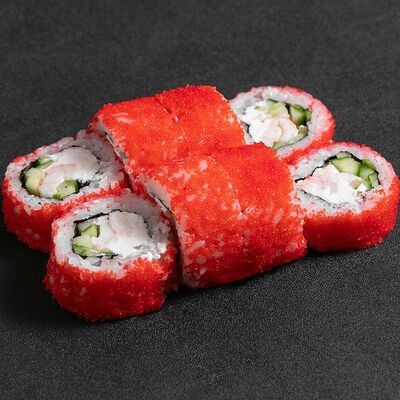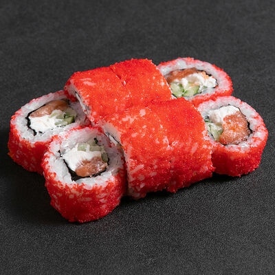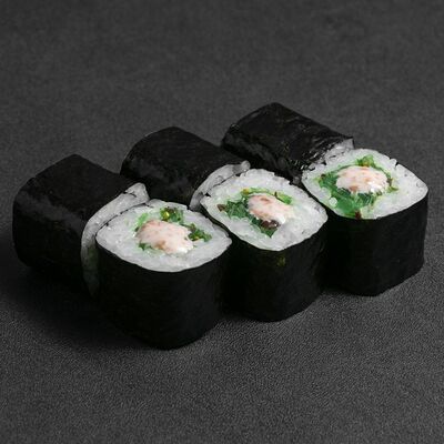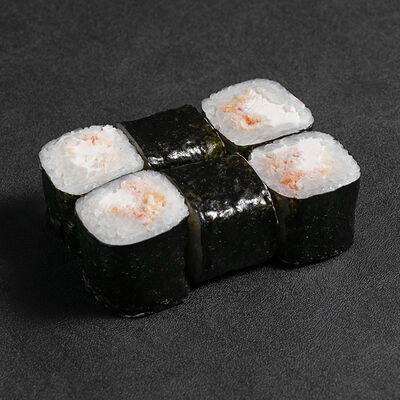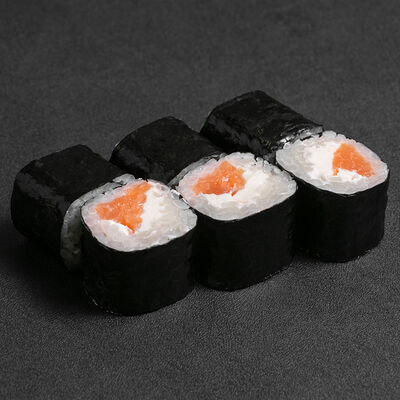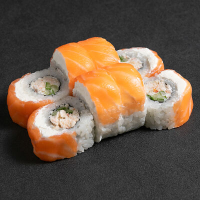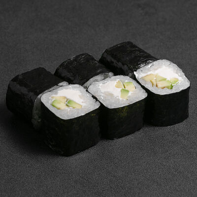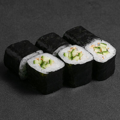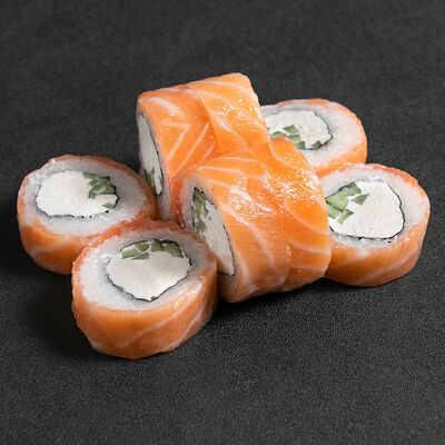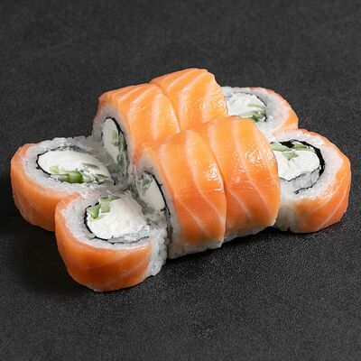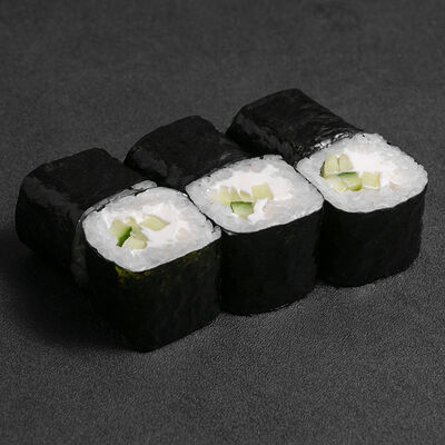 Огурец, лосось, сыр сливочный, имбирь, васаби, соевый соус, рис, нори. Кбжу: 141/6/8/13 (8 шт.)