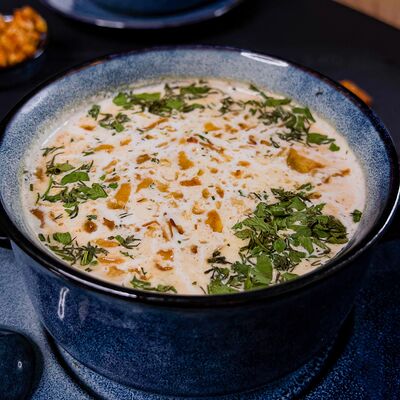 Нежный суп с картофелем, кубиками красной рыбы, в сливочном бульоне