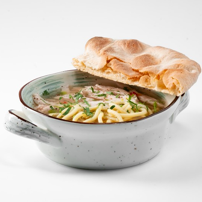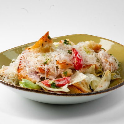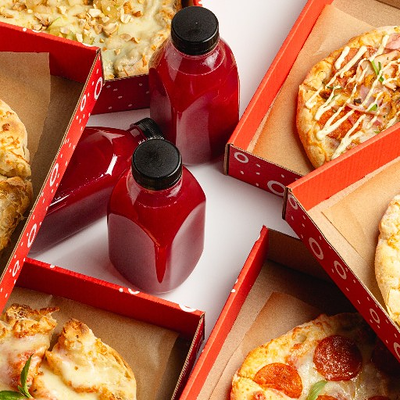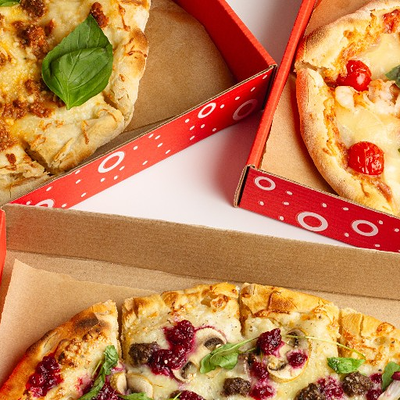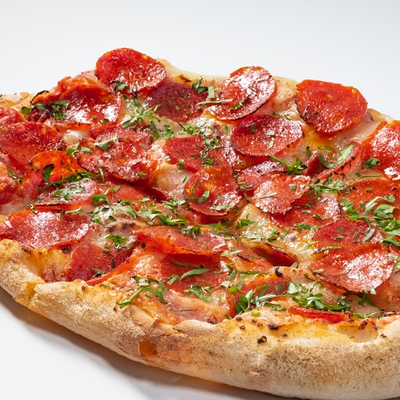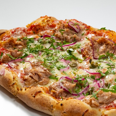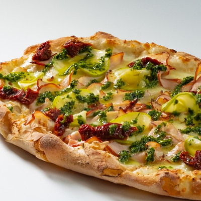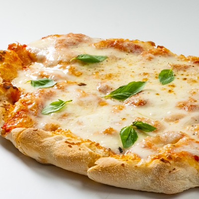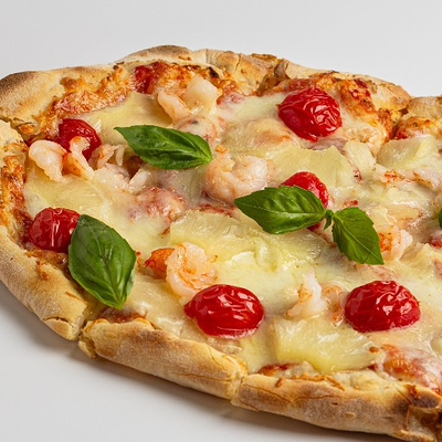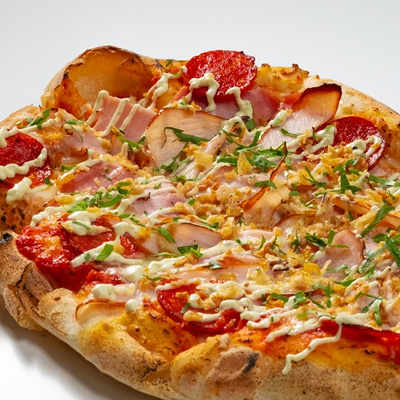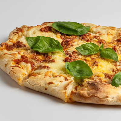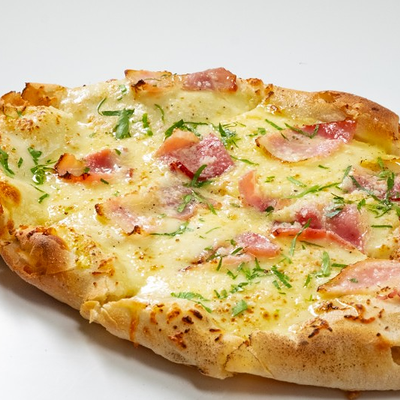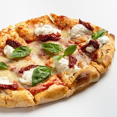 Фирменное хрустящее тесто под томатным соусом и сыром моцарелла, сливочный сыр буррата, мягкая сыровяленая ветчина прошутто, салат фриллис, пряное чесночное масло на основе оливкового (основа для пиццы 22x30 см)