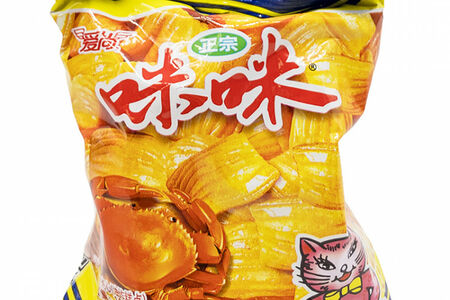 Мини-крекеры со вкусом краба. Состав: пшеничная мука, растительное масло, сахар, рыбный соус, соль из листьев лука, бикарбонат аммония, глутамат натрия, желтая свекла гардения красная, крабовый порошок, 5'-ароматизированный динатриевый нуклеотид, ароматизаторы, специи. Пищевая и энергетическая ценность на 100 г продукта: 2278 кДж, белки 7 г, жиры 34 г, углеводы 53 г, натрий 720 мг. Срок годности: 10 месяцев.