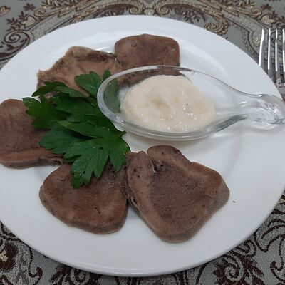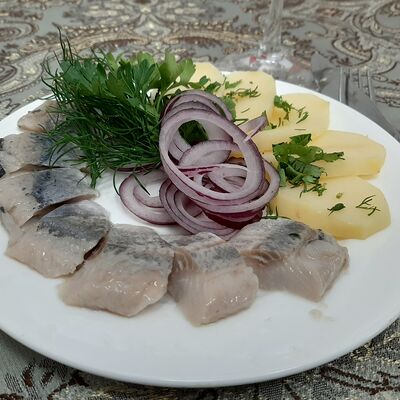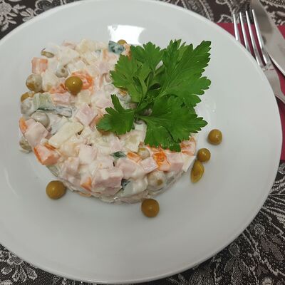 Колбаса полукопчёная, говядина, ветчина, картофель, маслины, солёный огурец, лимон, сметана
