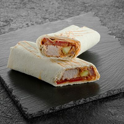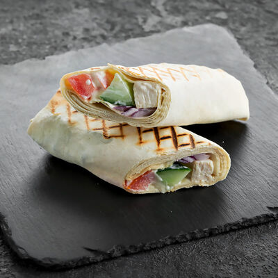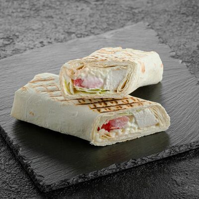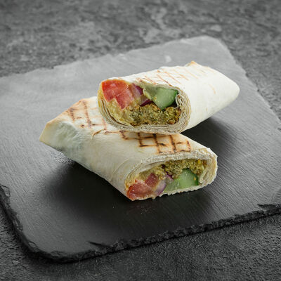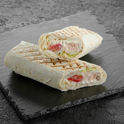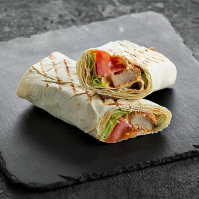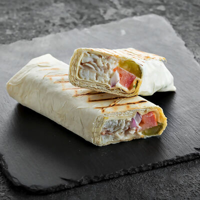 Филе трески, маринованные огурцы, томат, красный лук, лаваш, соус чесночный