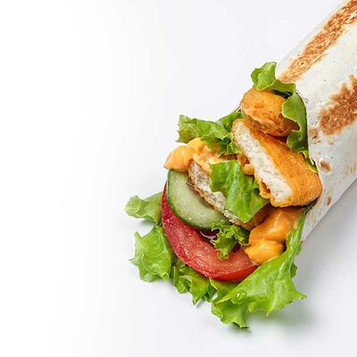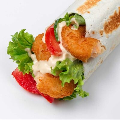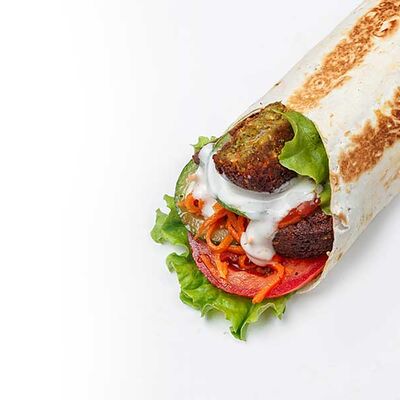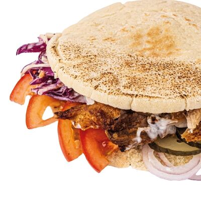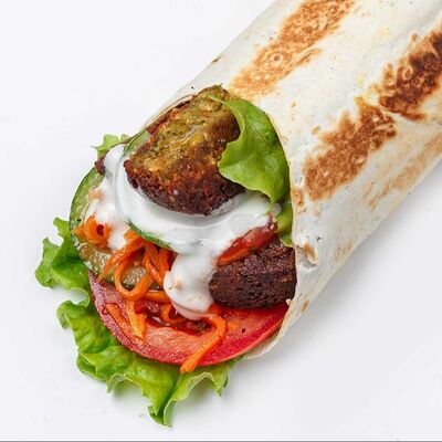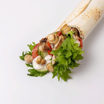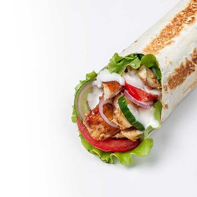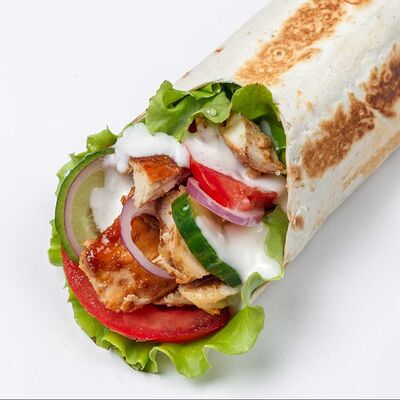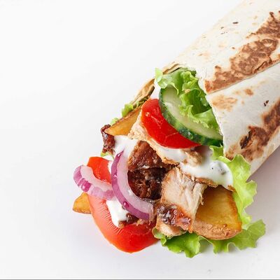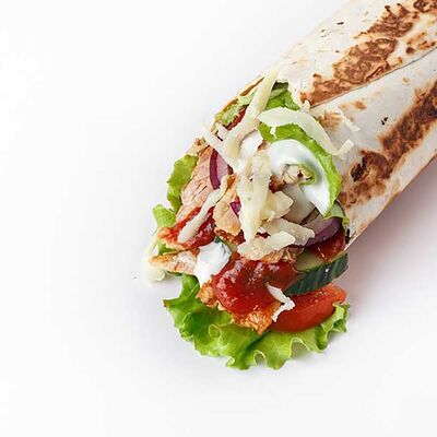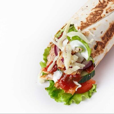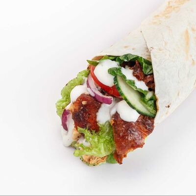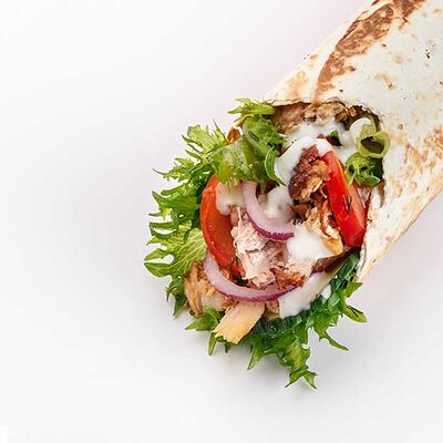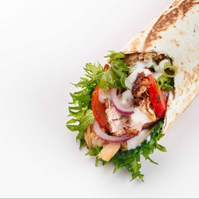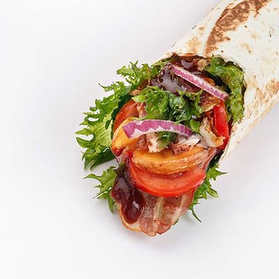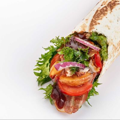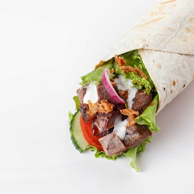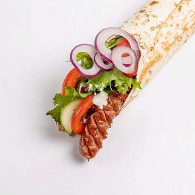 Говядина (брискет), капуста китайская, свежие овощи, соус клюквенный, чесночный соус на основе кефира, жареный лук, лаваш