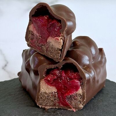 Рисовая мука, молоко 1%, кокосовое масло, разрыхлитель, яйцо, какао, творожный сыр, белый шоколад без сахара, подсластитель, финиковый сироп, малина, смородина. Без сахара