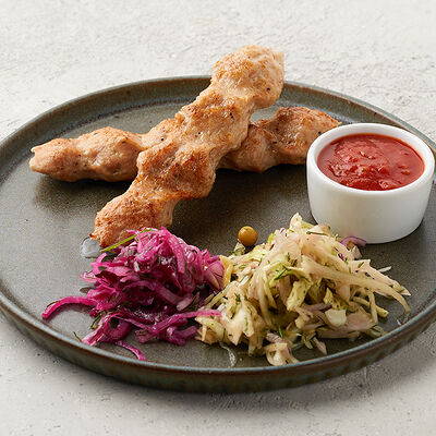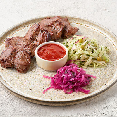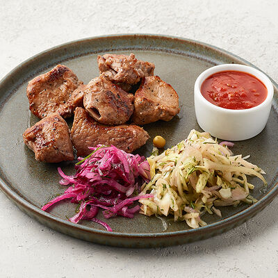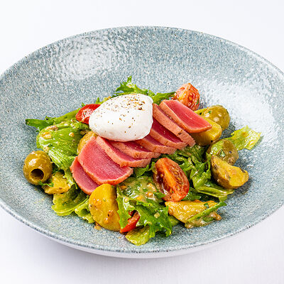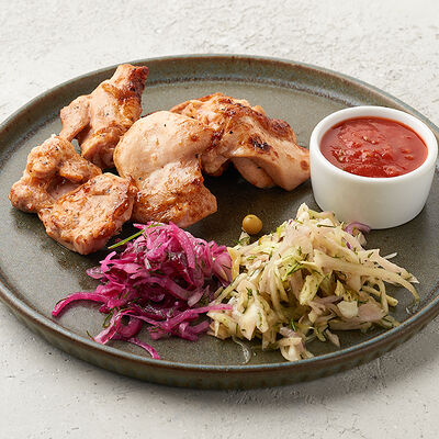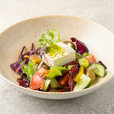 Огурцы, Фета, Болгарский перец, Заправка для греческого салата, Салат Айсберг, Красный лук, Оливки каламата, Черный перец