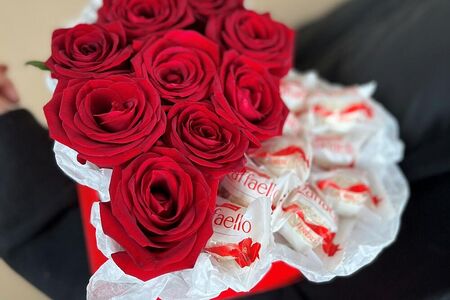 Роза red naomi - 9 шт. Раффаэлло - 90 г. Упаковка - 2 шт. Коробка - 1 шт. Оазис - 1 шт